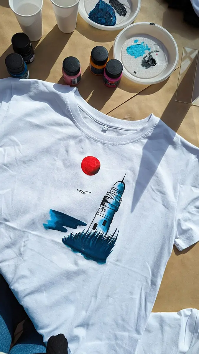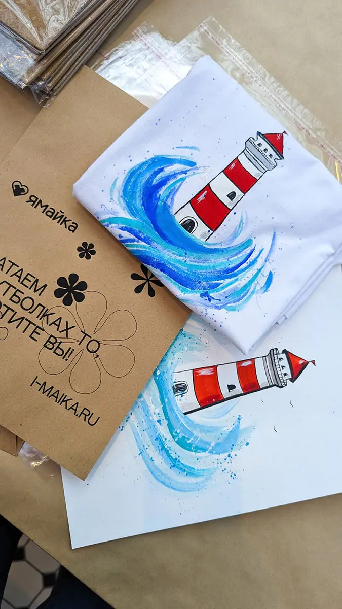 16:30-18:00 — «Маяк с волнами» текстильными маркерами на белой футболке. Преподаватель — Ольга Алимова