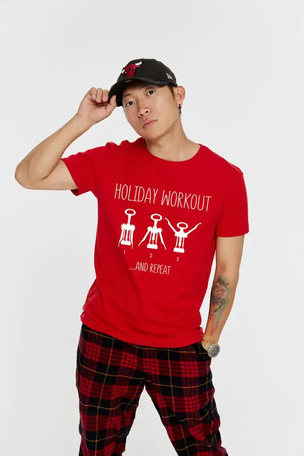 Футболка с принтом «Holiday Workout» — дизайн с яркой отсылкой к спортивной тематике, шутливо намекающий, что в новогодние праздники основные подходы делаются за праздничным столом.