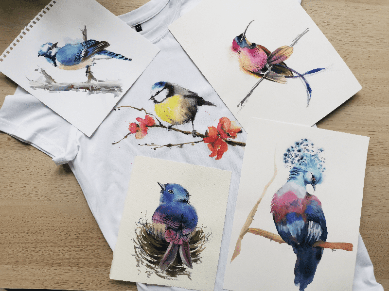 Не могу сказать, что я уже нашла свой стиль, я в постоянном процессе поиска… Но многие считают, что особенно хорошо мне удаются акварельные птицы, которых я и решила попробовать напечатать на футболках. Легкость переливов акварельной краски в сочетании с тонкой графичностью линий – оказалось, что именно это хорошо смотрится на ткани.