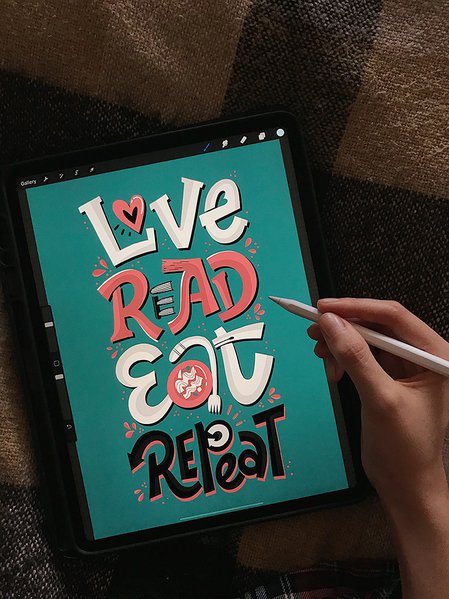 Мои любимые инструменты для леттеринга — это механический карандаш, линер и маркер. Эскизы я всегда делаю на обычной офисной бумаге, далее дорабатываю в векторе на компьютере. Последний год всё чаще работаю на айпаде в программе procreate. Это стало моим открытием и теперь служит незаменимым помощником в создании любых задуманных идей!