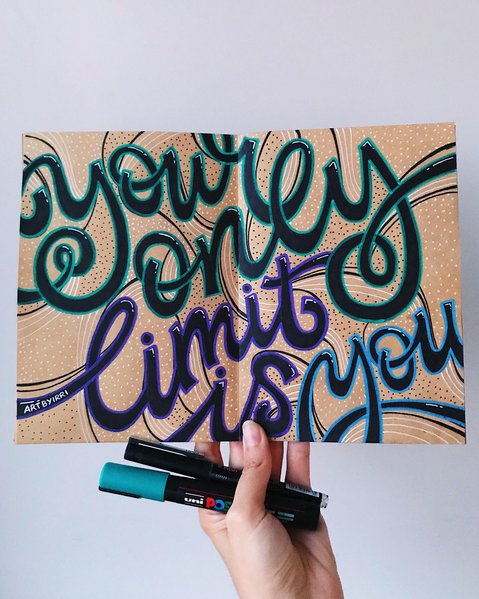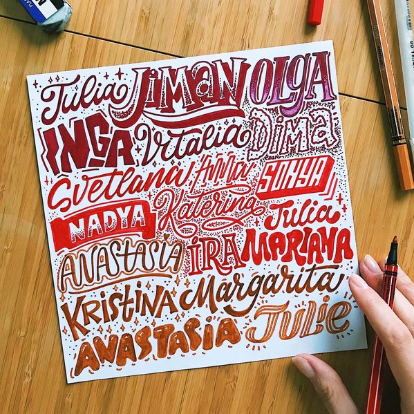 Вдохновение я черпаю из различных источников. Например со страниц художников в инстаграмме. Я не выделяю кого-то одного, ведь порой и начинающий художник может зацепить чем-то эдаким. Очень люблю заглядывать в книжные магазины и любоваться обложками книг. А так же часто брожу по городу и собираю идеи с вывесок, афиш, архитектурных и природных форм. На данный момент я изучаю книгу Юрия Гордона «От А до Я» и совсем недавно получила посылку из США с книгой Кена Барбера «Lettering Manual», она очень хороша! Желаю всем успехов с буквами! Будьте смелее и пробуйте разное!