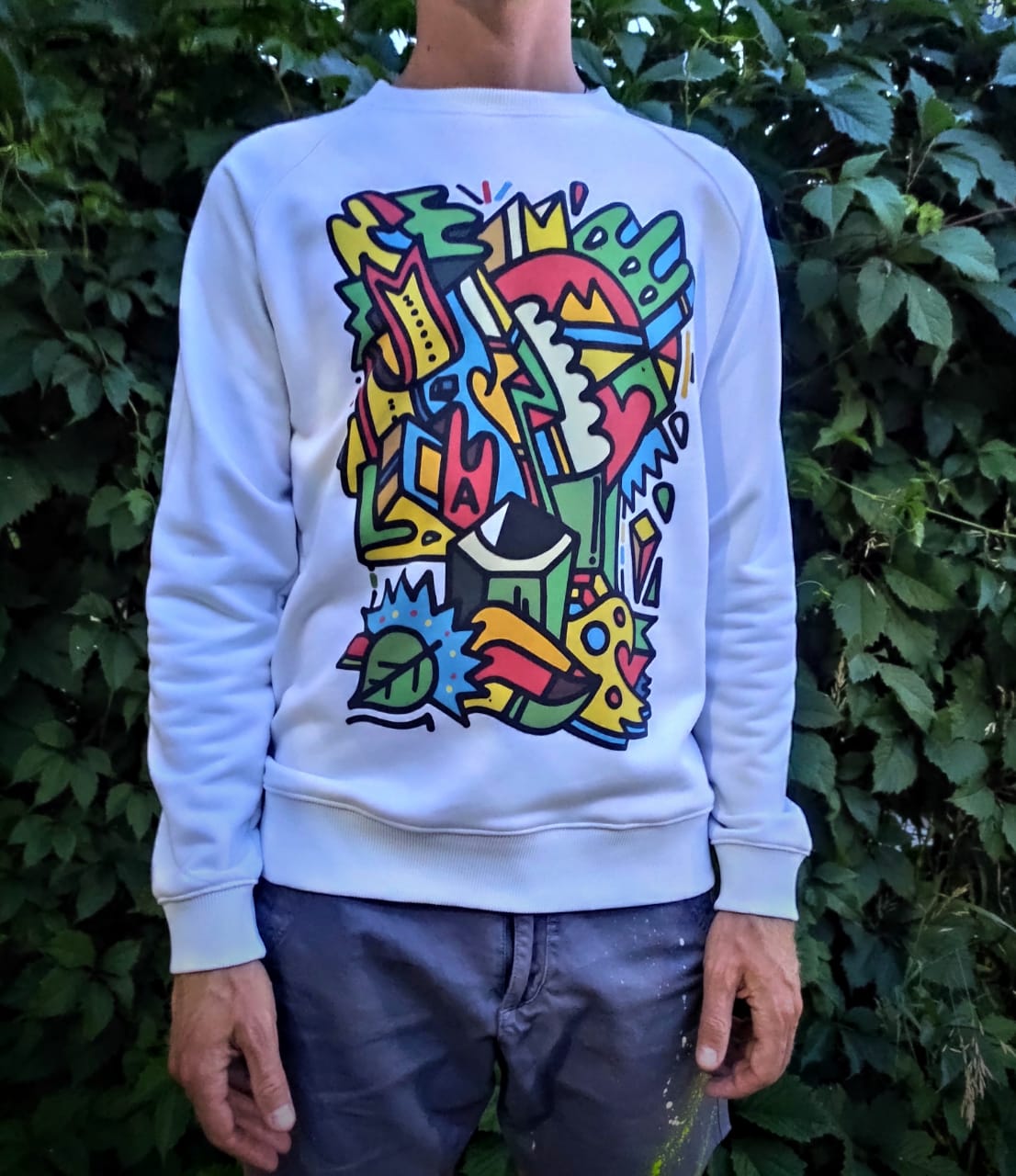 ДК: – Мне нравится смотреть на то, как мои работы живут своей жизнью, поэтому я всегда рад если есть возможность их реализовать. Я очень давно и сейчас довольно часто печатаю свои принты на шопперах, свитшотах или худи – это круто, когда ты даришь или сам носишь вещь со своим принтом – душа поет ) Сейчас практически не осталось ограничений на печать, поэтому можно экспериментировать и создавать свой мерч без преград.