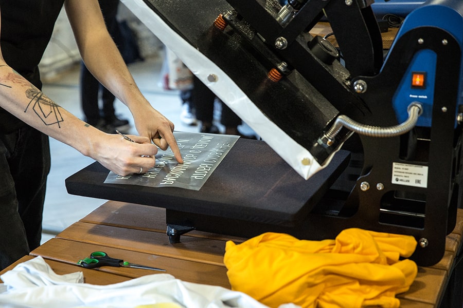 Принт закрепляется с помощью термопресса при контакте изделия с плитой термопресса при температуре 170 °C. В связи с этим возможно образование следов давления на ткани, которые легко устранить постирав изделие.