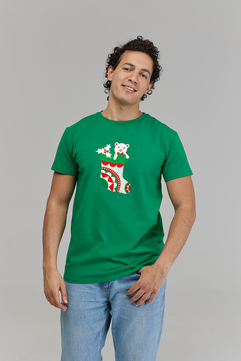 Дарите улыбки вместе с веселой футболкой с новогодним принтом «Носочек». Этот обаятельный дизайн, изображающий милый новогодний носочек, добавит нотки радости и праздника в ваш наряд.