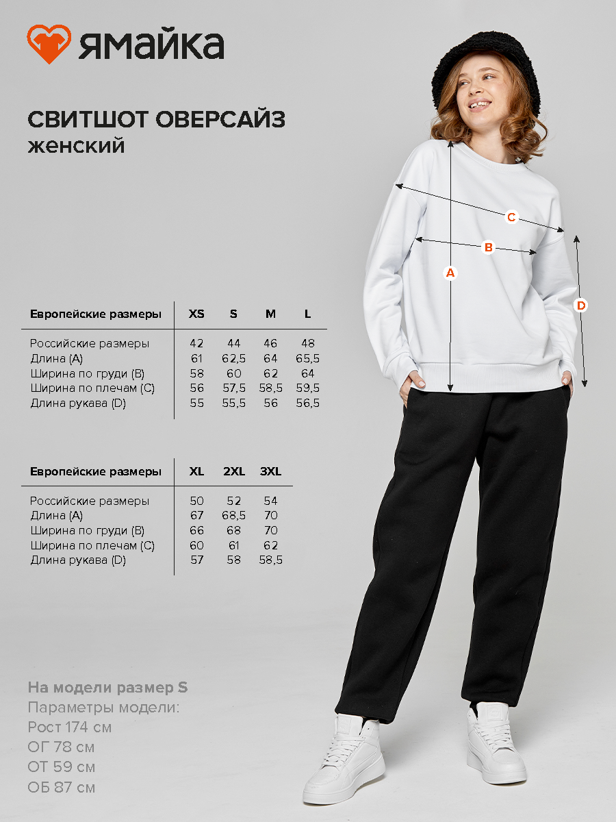 Свитшот оверсайз из качественного турецкого полотна (футер трёхнитка) с мягким велюром внутри: 100% хлопок. Плотность 350 г/м2. Объемный силуэт, слегка расширенный плечевой пояс, зауженный к низу рукав. Конструкция со спущенным плечевым швом обеспечивает удобную посадку и не сковывает движений. Крой свитшота – женский.