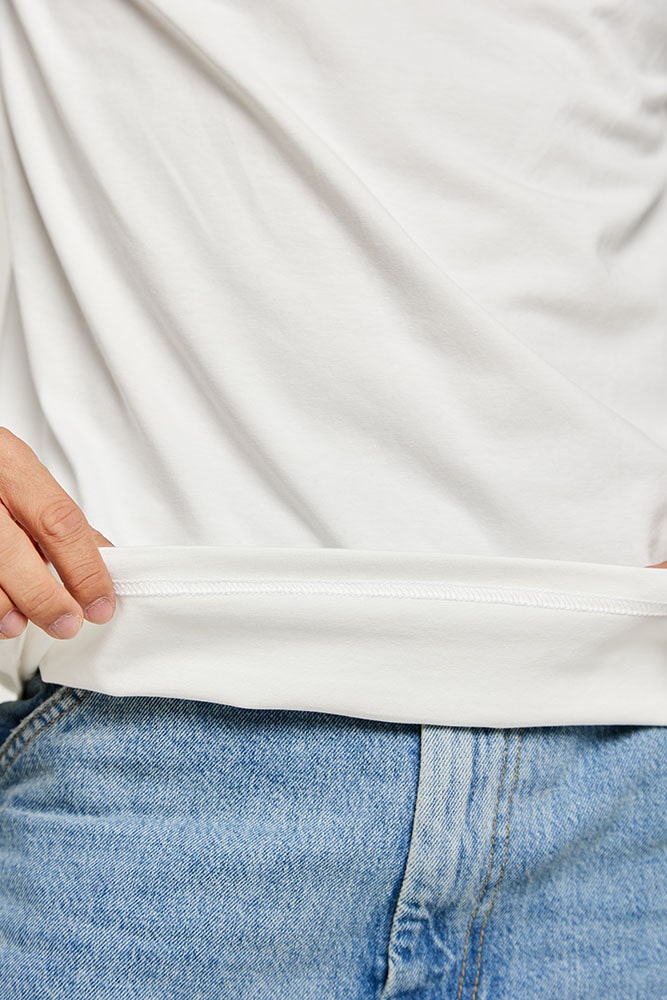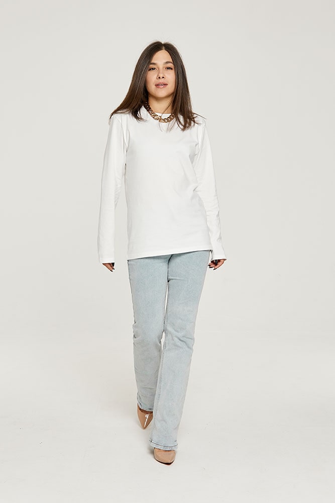 Футболка женская из кулирной глади, 100% хлопок. Плотность 180г/м2. Свободный силуэт, удлиненный рукав и круглый воротник. Низ футболки и низ рукава обработаны швом в подгибку шириной в 2 см.