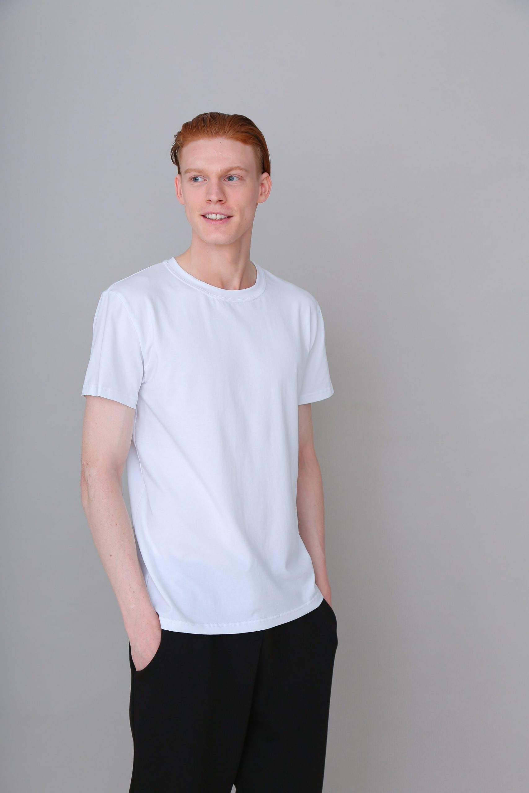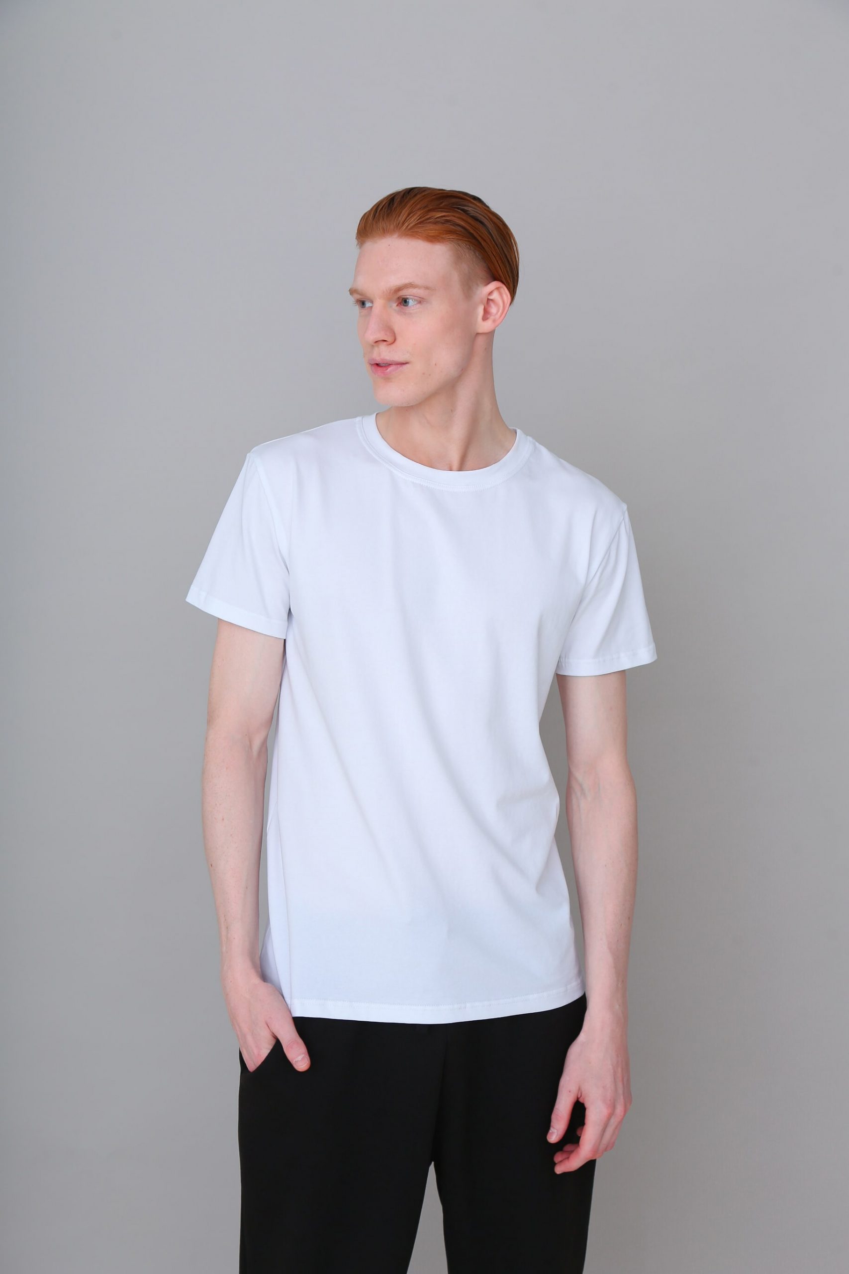 Футболка мужская из кулирной глади, 100% хлопок. Плотность 180г/м2. Прямой традиционный силуэт, короткий рукав и круглый воротник. Низ футболки и низ рукава обработаны швом в подгибку шириной в 2см. Крой обеспечивает комфорт и практичность.