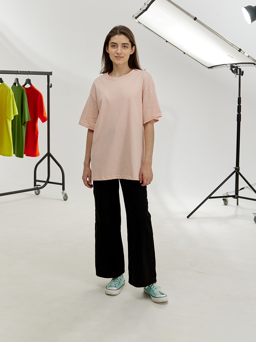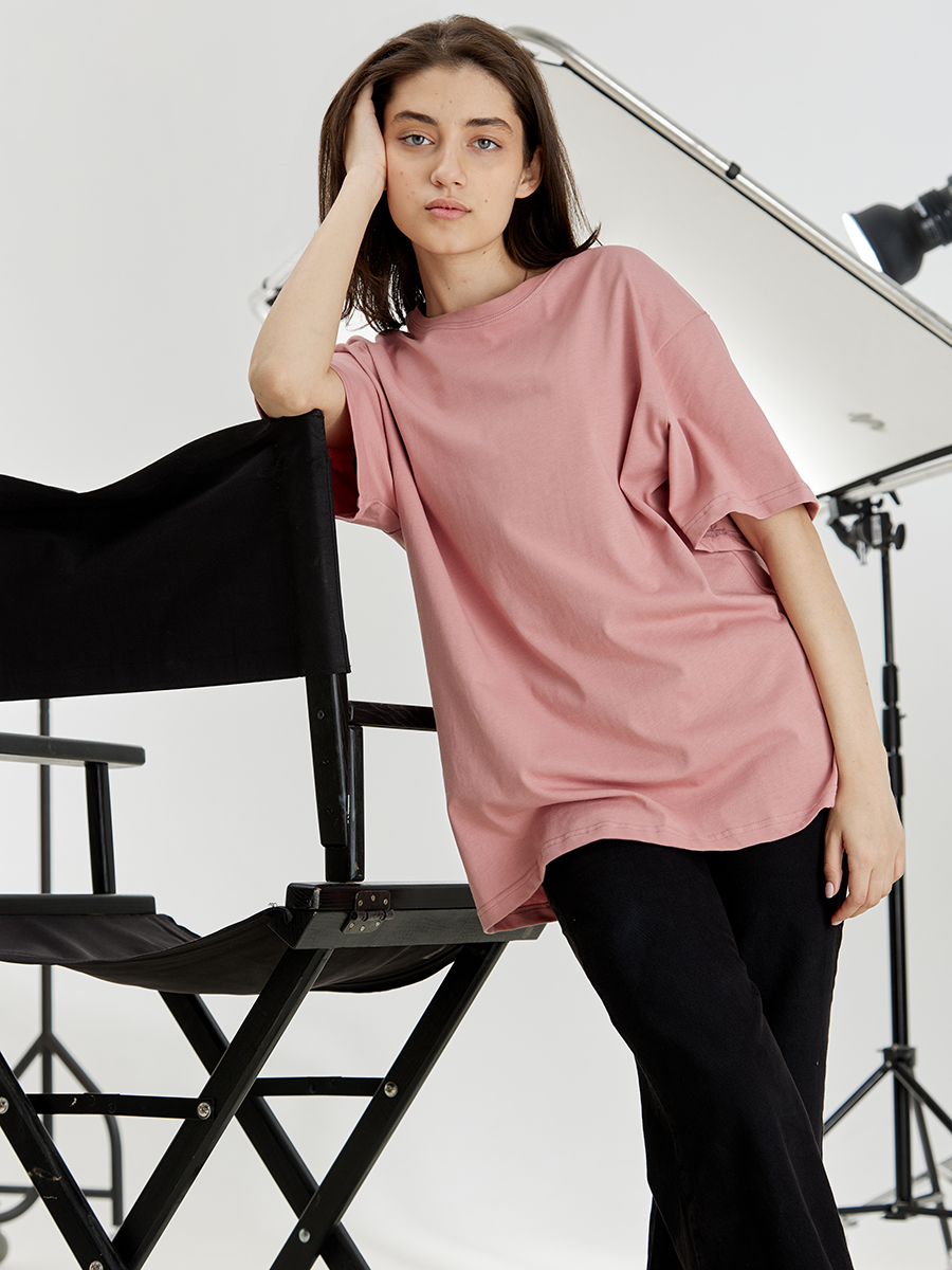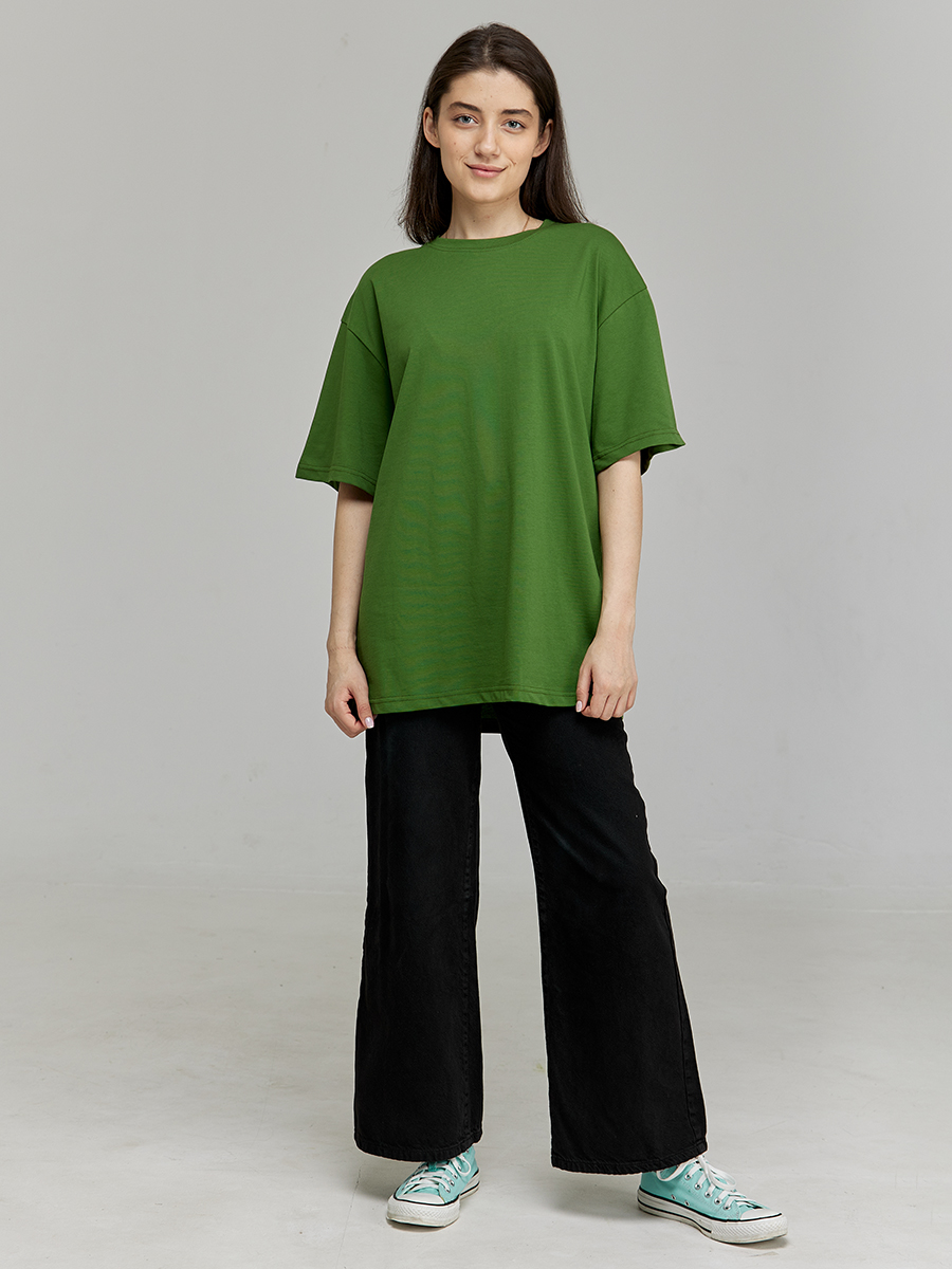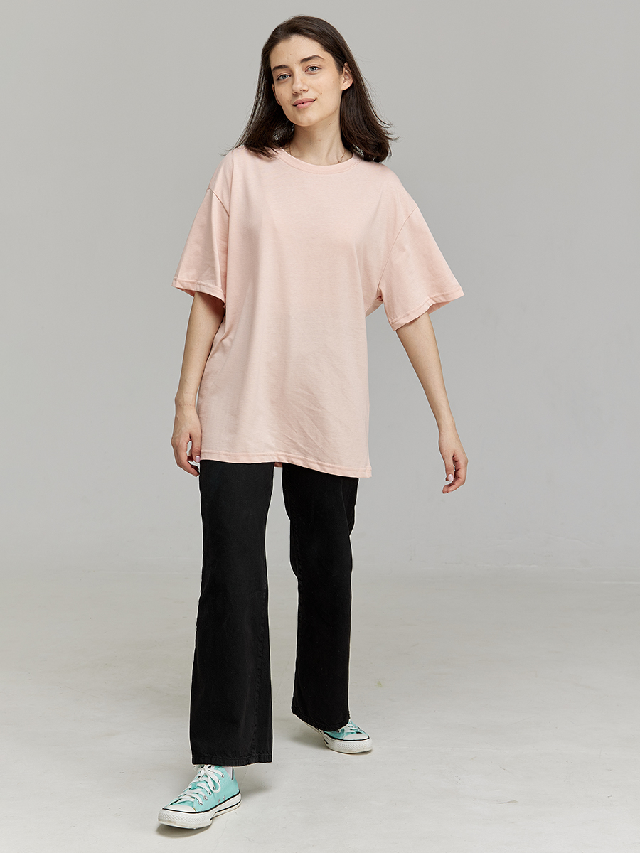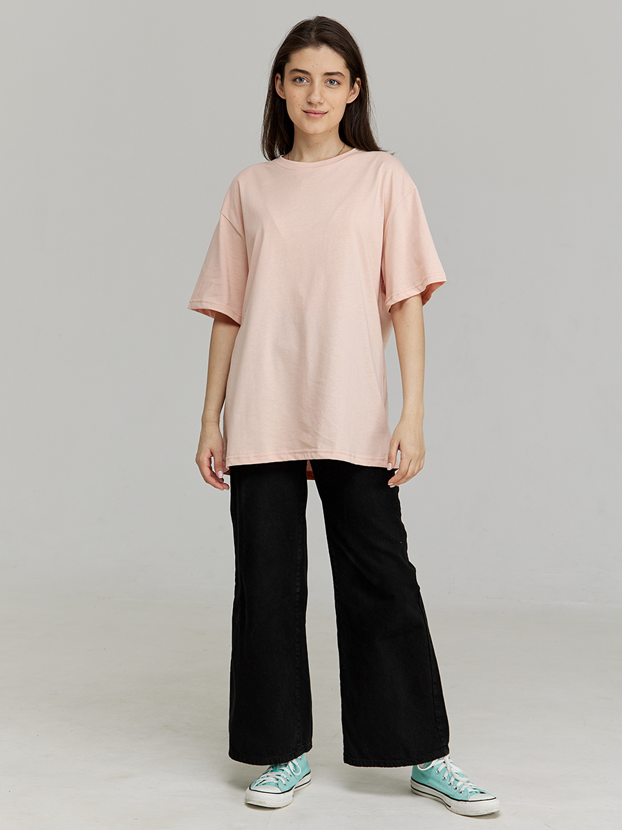 Футболка женская из кулирной глади, 100% хлопок. Плотность 180г/м2. Свободный силуэт, удлиненный рукав и круглый воротник. Низ футболки и низ рукава обработаны швом в подгибку шириной в 2 см.
