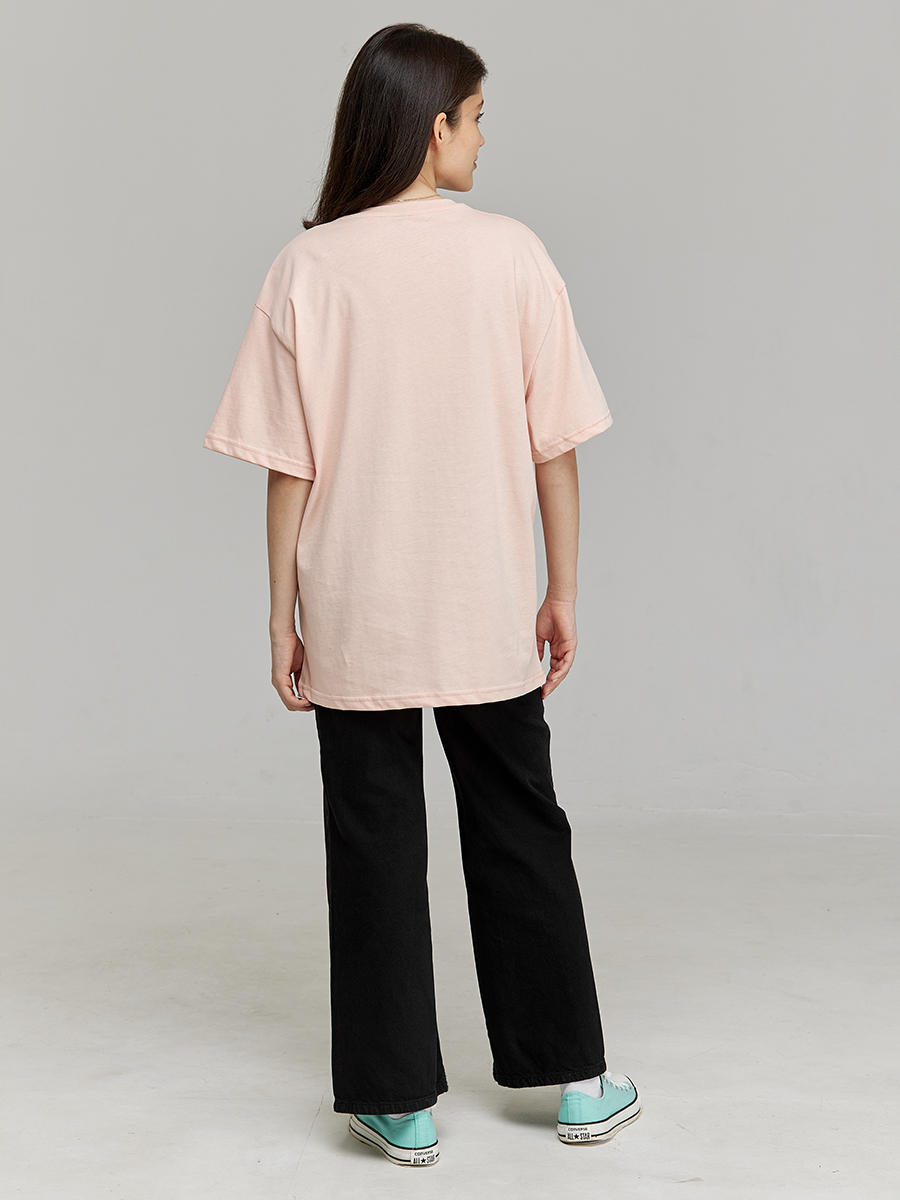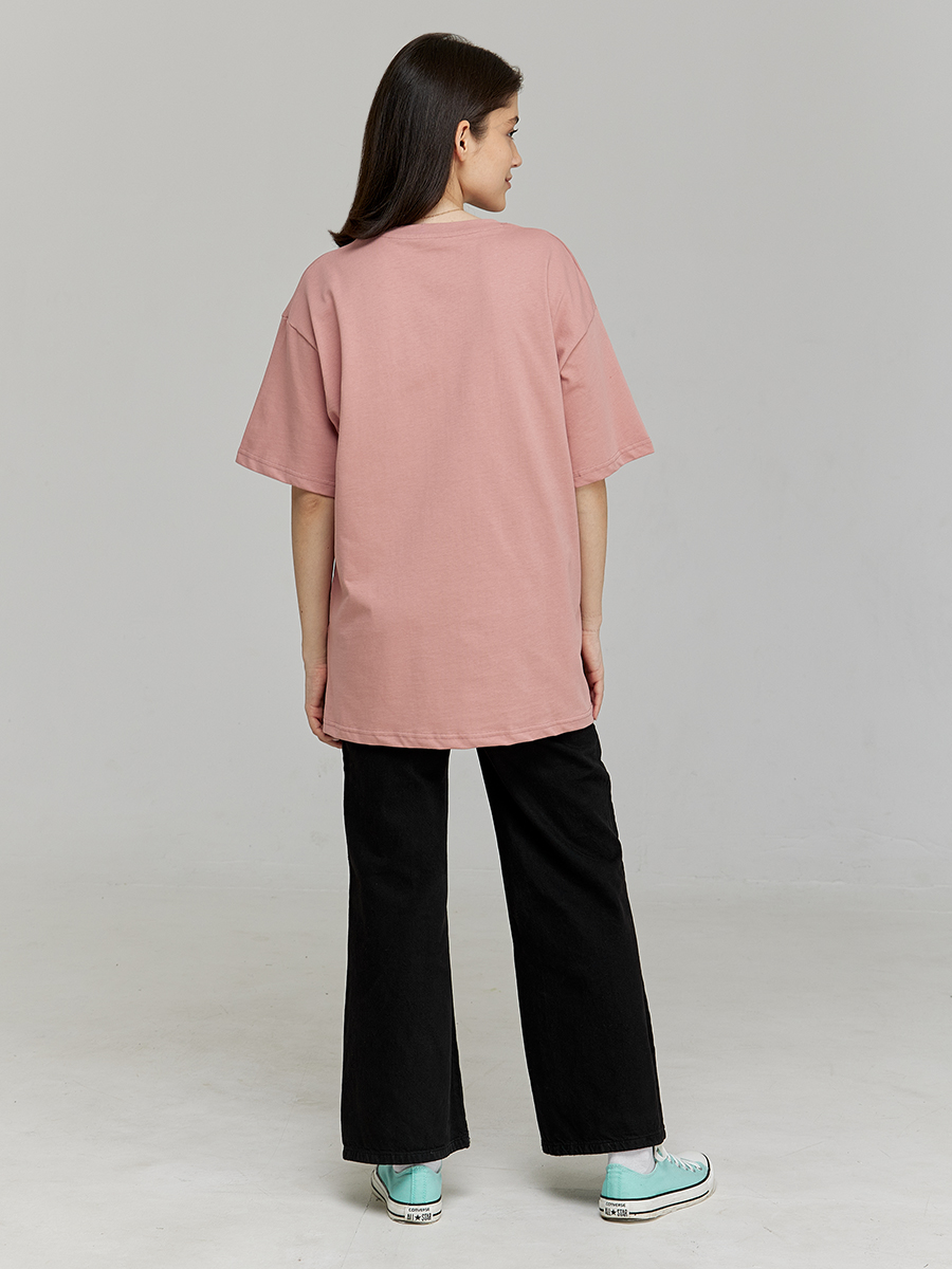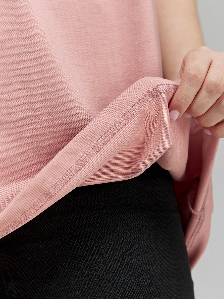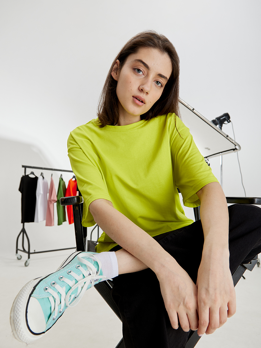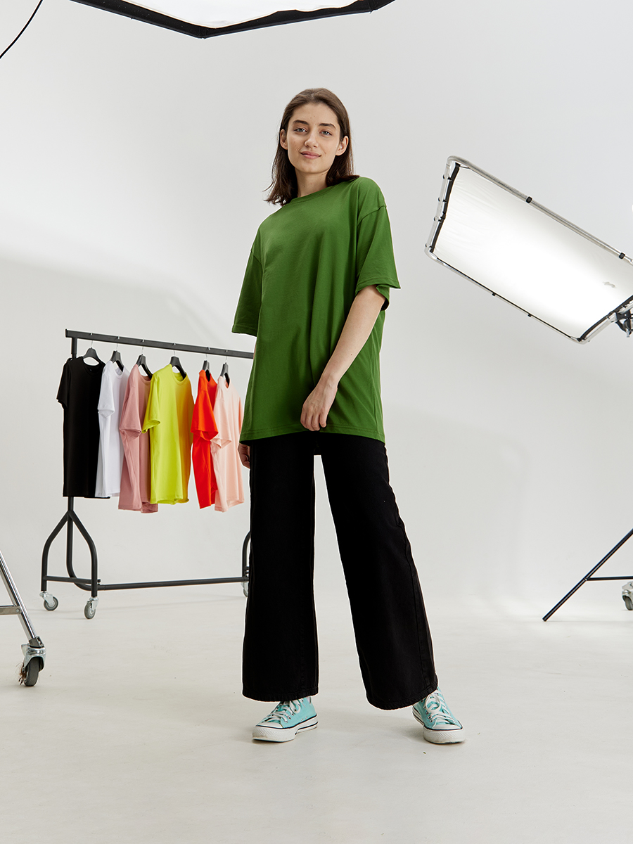 Футболка женская из кулирной глади, 100% хлопок. Плотность 180г/м2. Свободный силуэт, удлиненный рукав и круглый воротник. Низ футболки и низ рукава обработаны швом в подгибку шириной в 2 см.