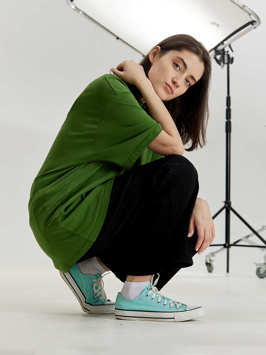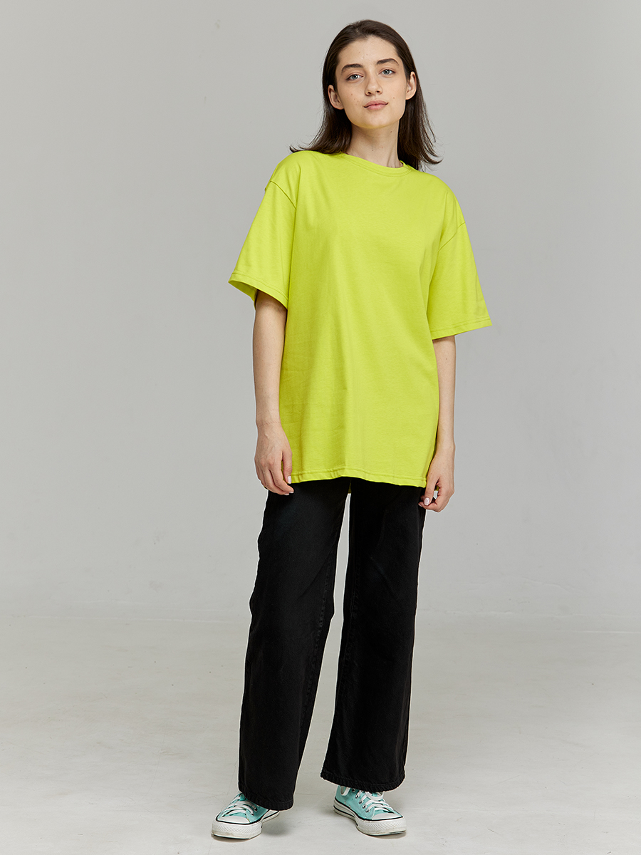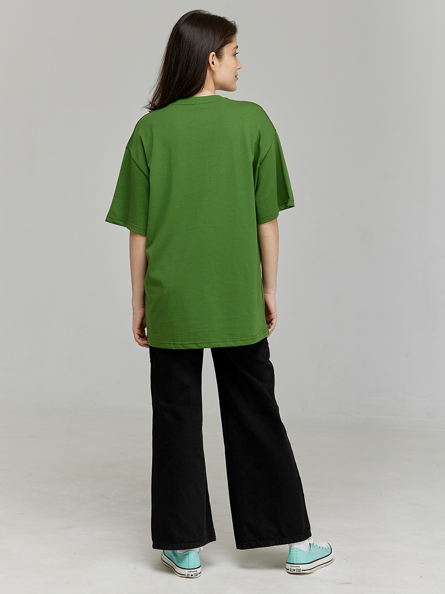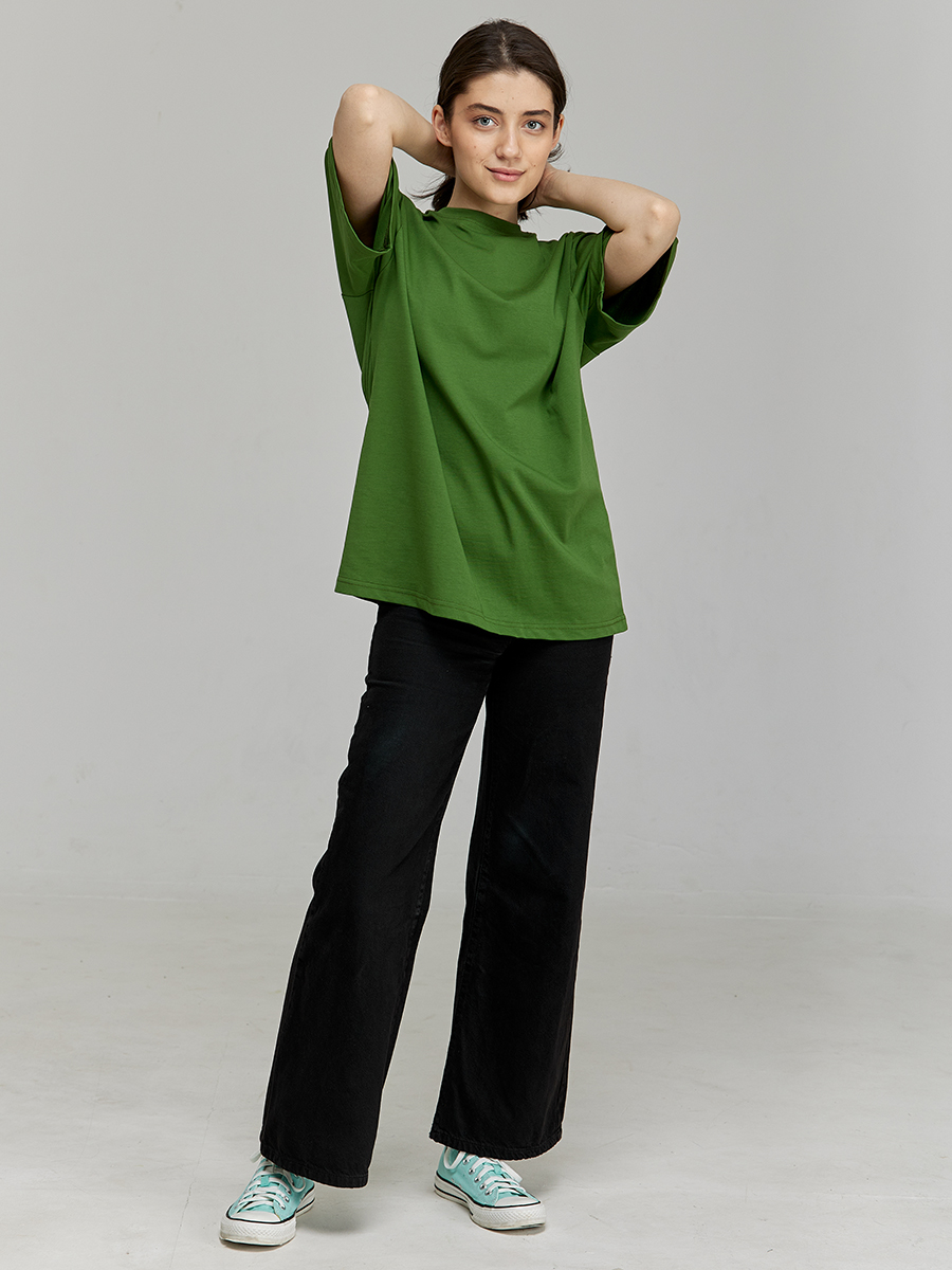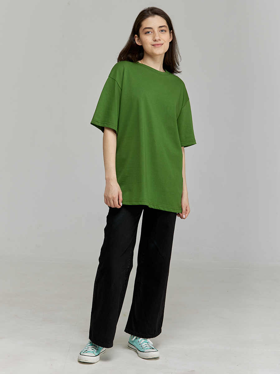 Футболка оверсайз из кулирной глади. Фасон унисекс. Состав: 100% хлопок. Плотность: 180 г/м2. Свободный актуальный крой, заниженная линия плеч. Круглый воротник из основного полотна, шов ворота закрыт киперной лентой. Необходимая вещь в гардеробе для повседневного образа.