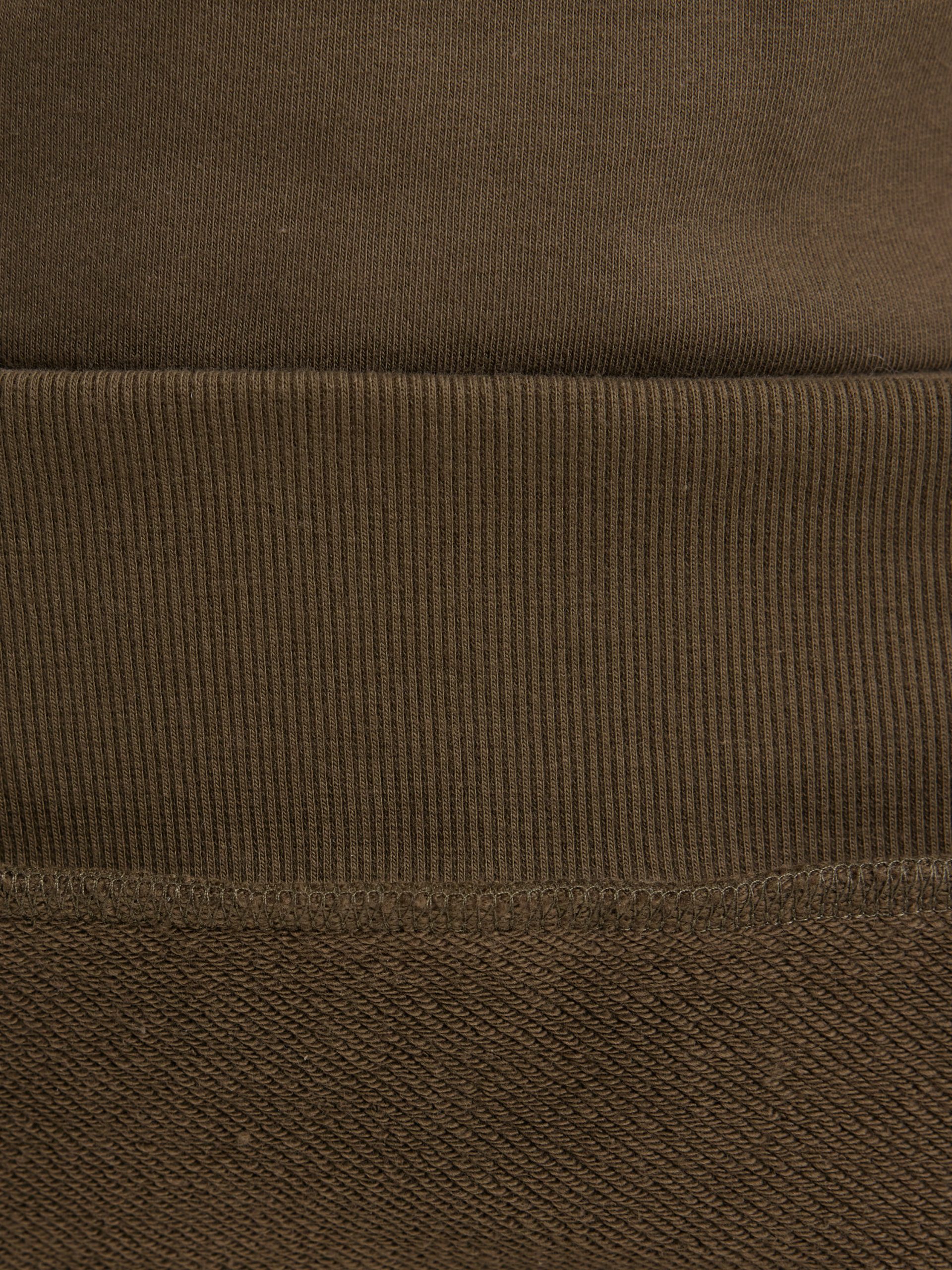 Свитшот из футера трёхнитки без начёса: 70% хлопок и 30% полиэстер. Плотность 350 г/м2. Прямой силуэт, пояс и манжеты рукавов выполнены из эластичной резинки. Круглая горловина обработана киперной лентой для защиты от растяжения. Особенность модели – рукав реглан. Рукав выкраивается вместе с плечевой частью изделия и пришивается к горловине. Конструкция со смещенным плечевым швом обеспечивает удобную посадку и не сковывает движений. Крой свитшота – унисекс, подходит как мужчинам, так и женщинам.