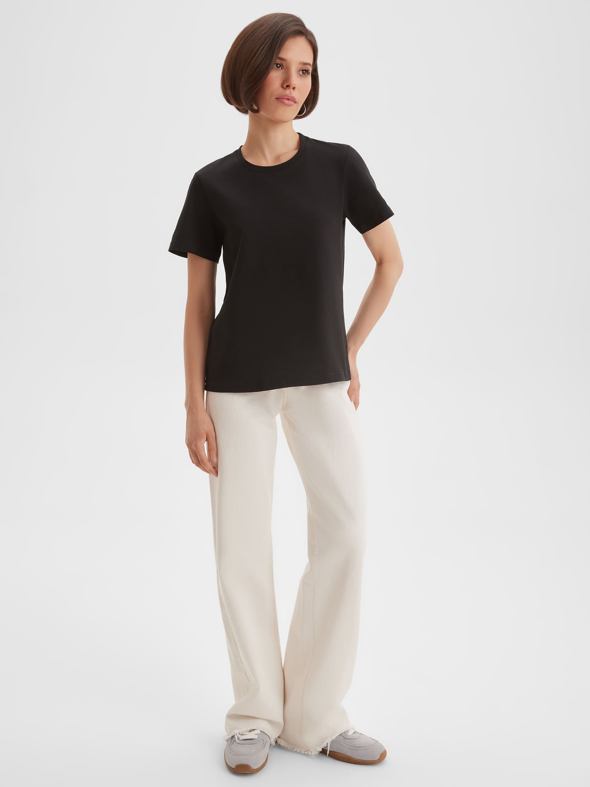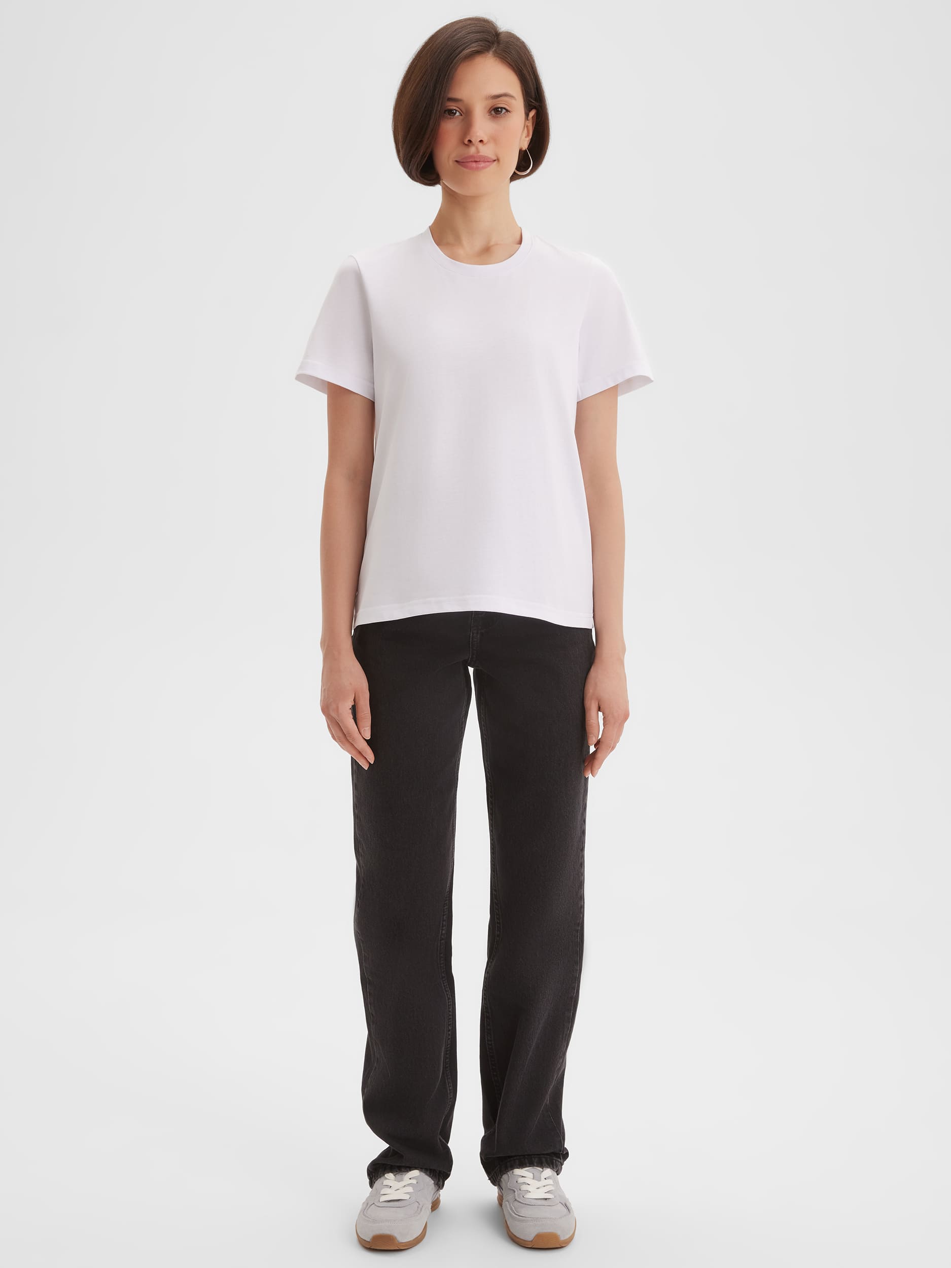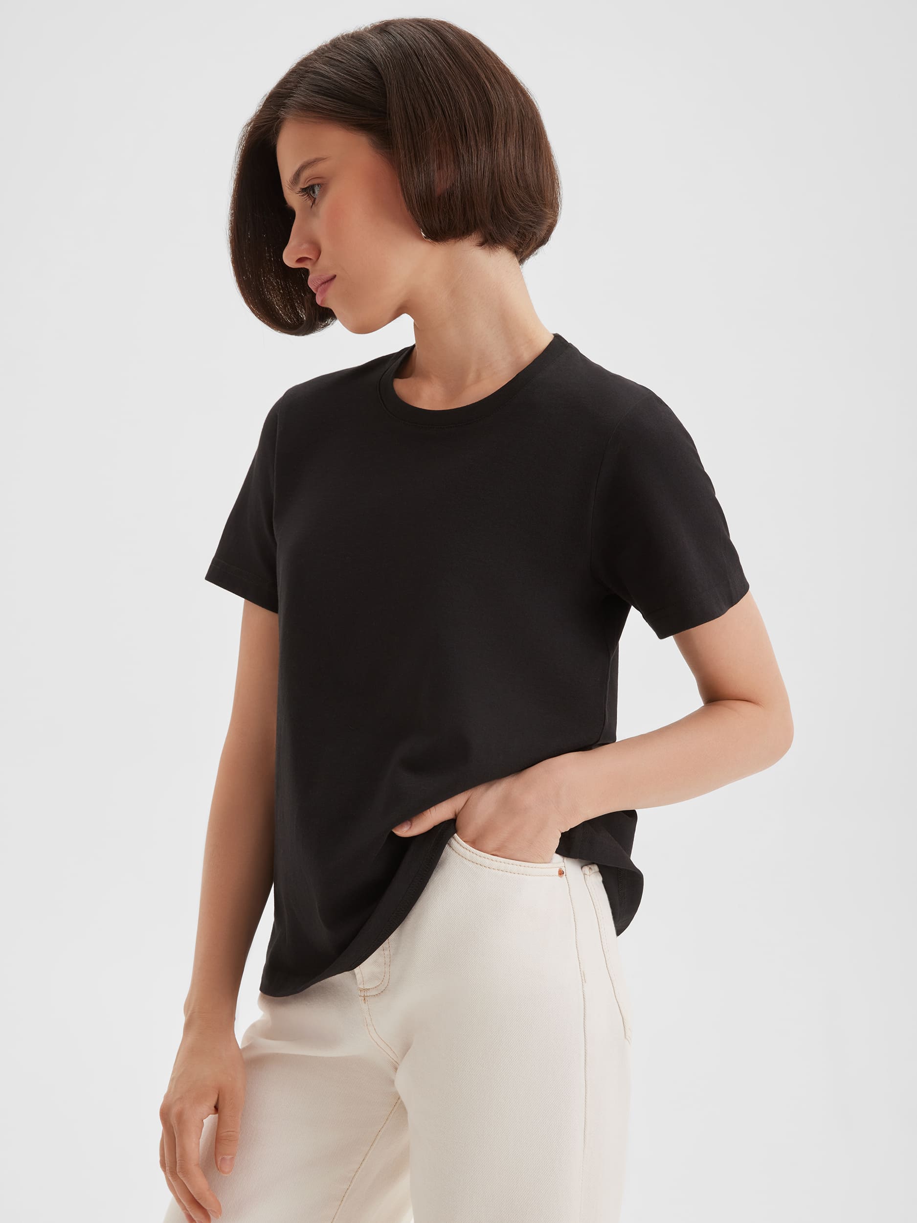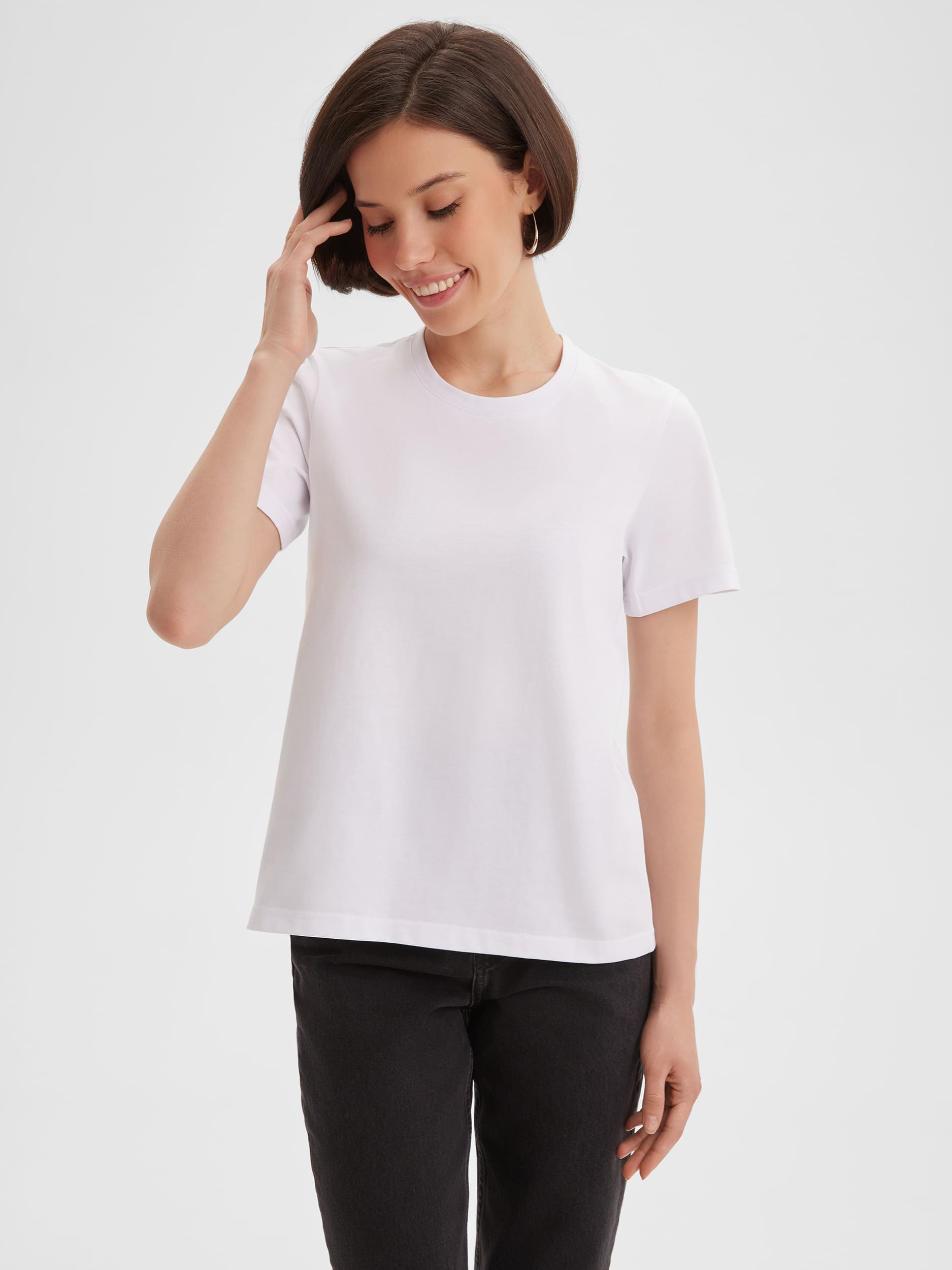 Футболка женская из кулирной глади, 100% хлопок. Плотность 180г/м2. Прилегающий силуэт, короткий рукав и круглый воротник. Низ футболки и низ рукава обработаны швом в подгибку шириной в 2 см. Приталенный крой выгодно подчеркивает женскую фигуру.