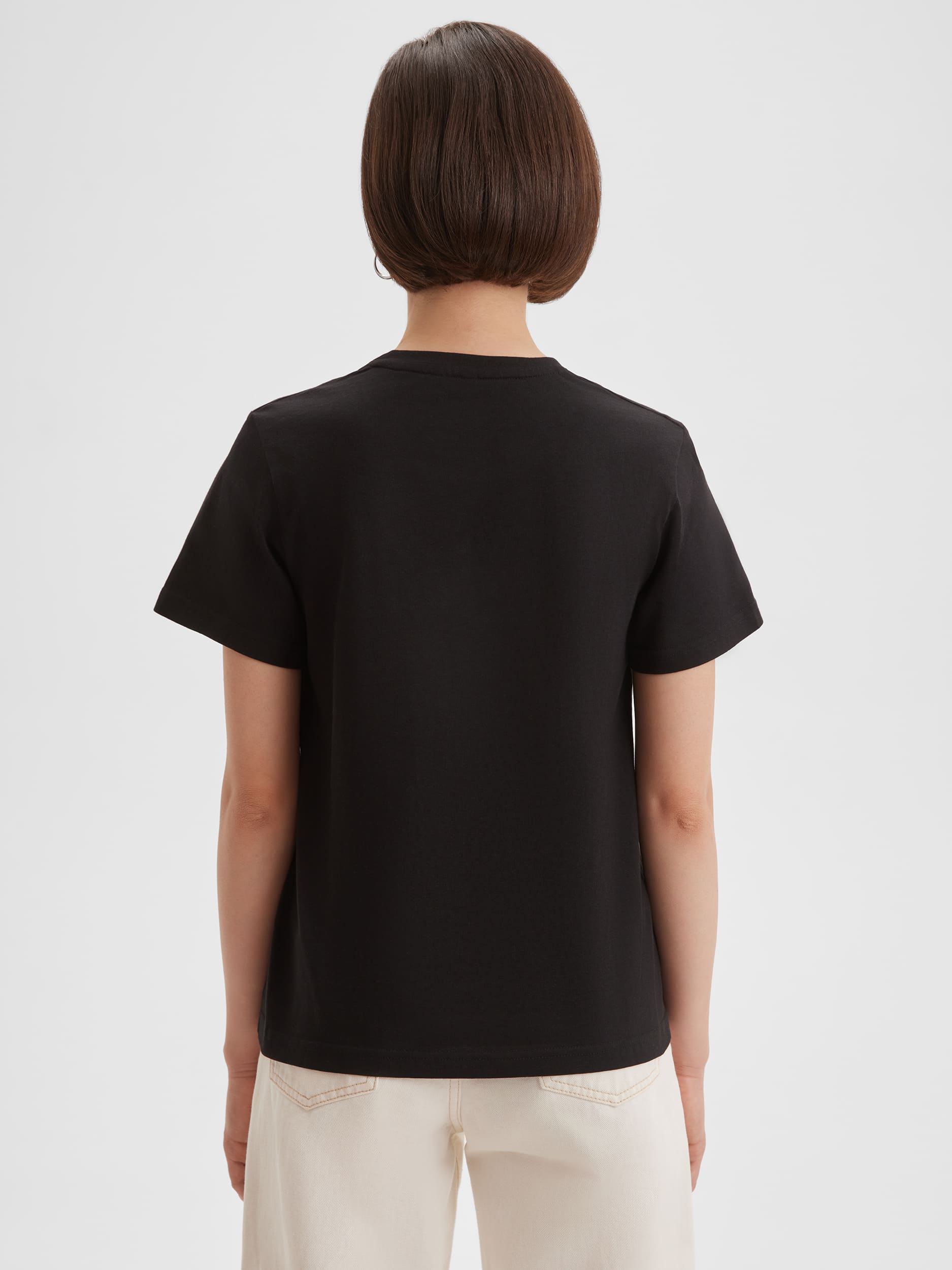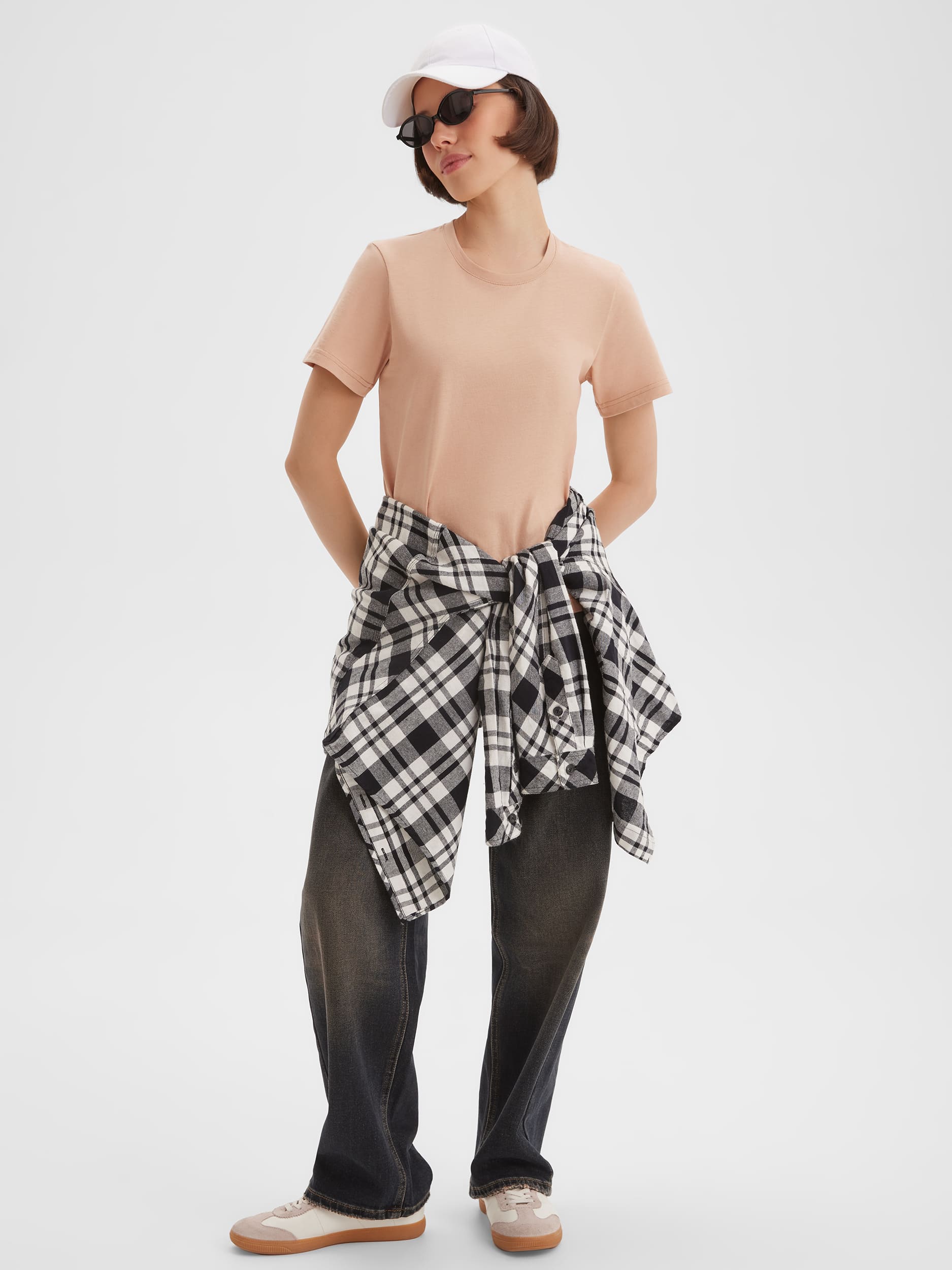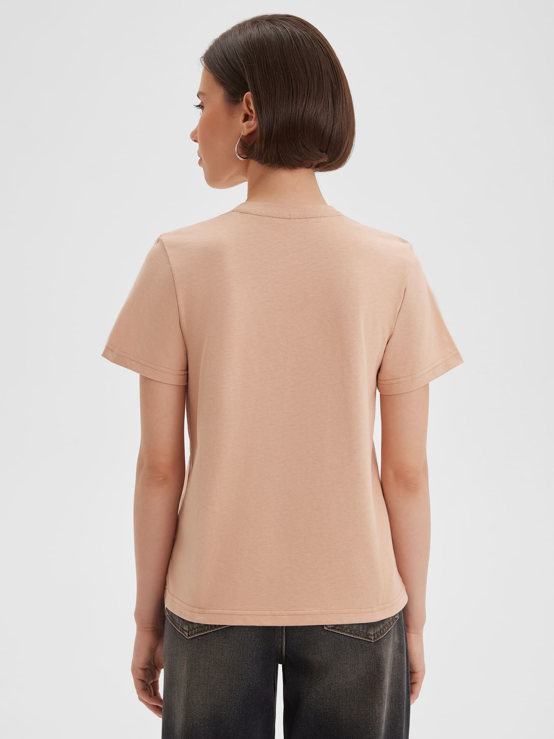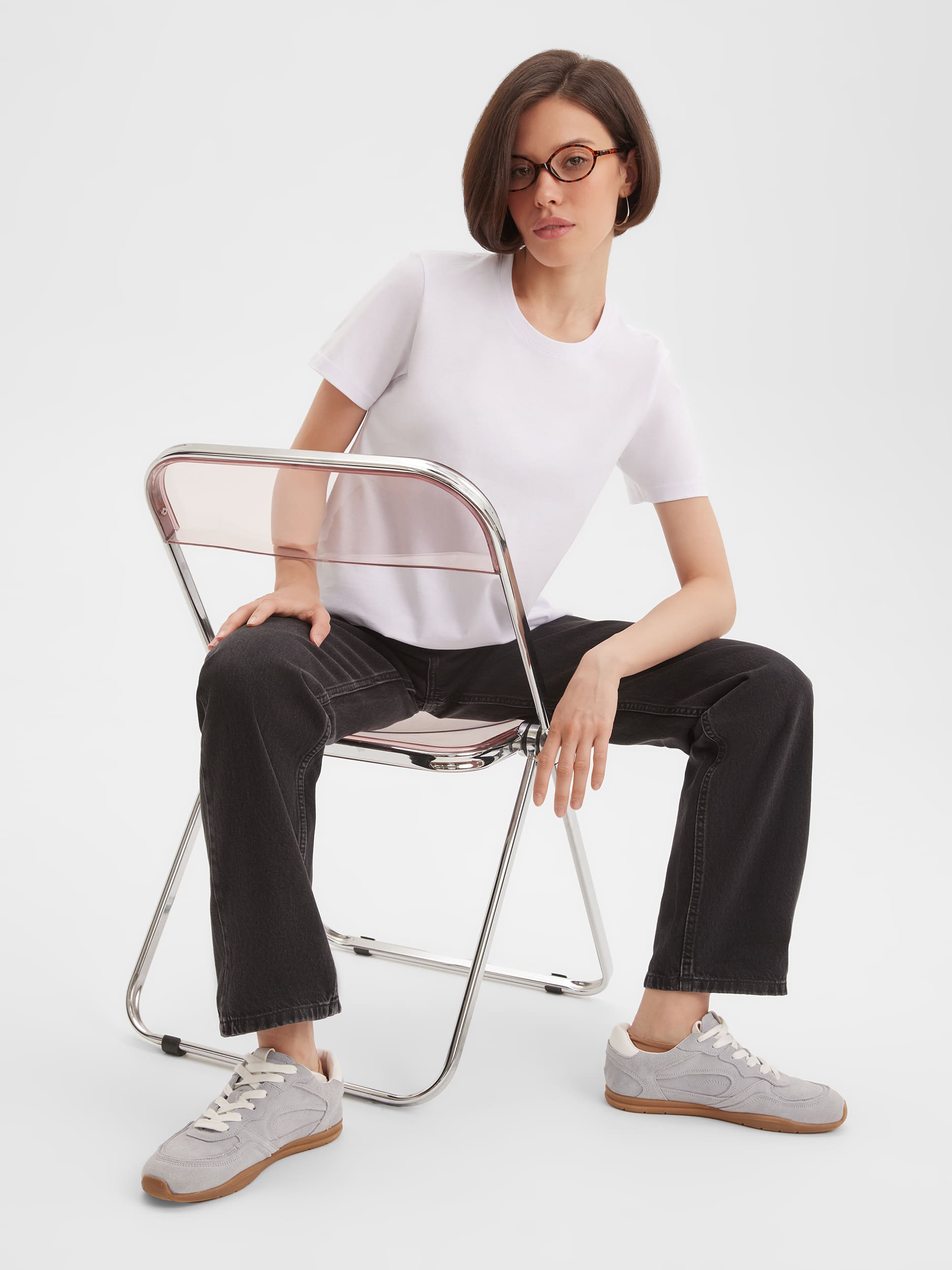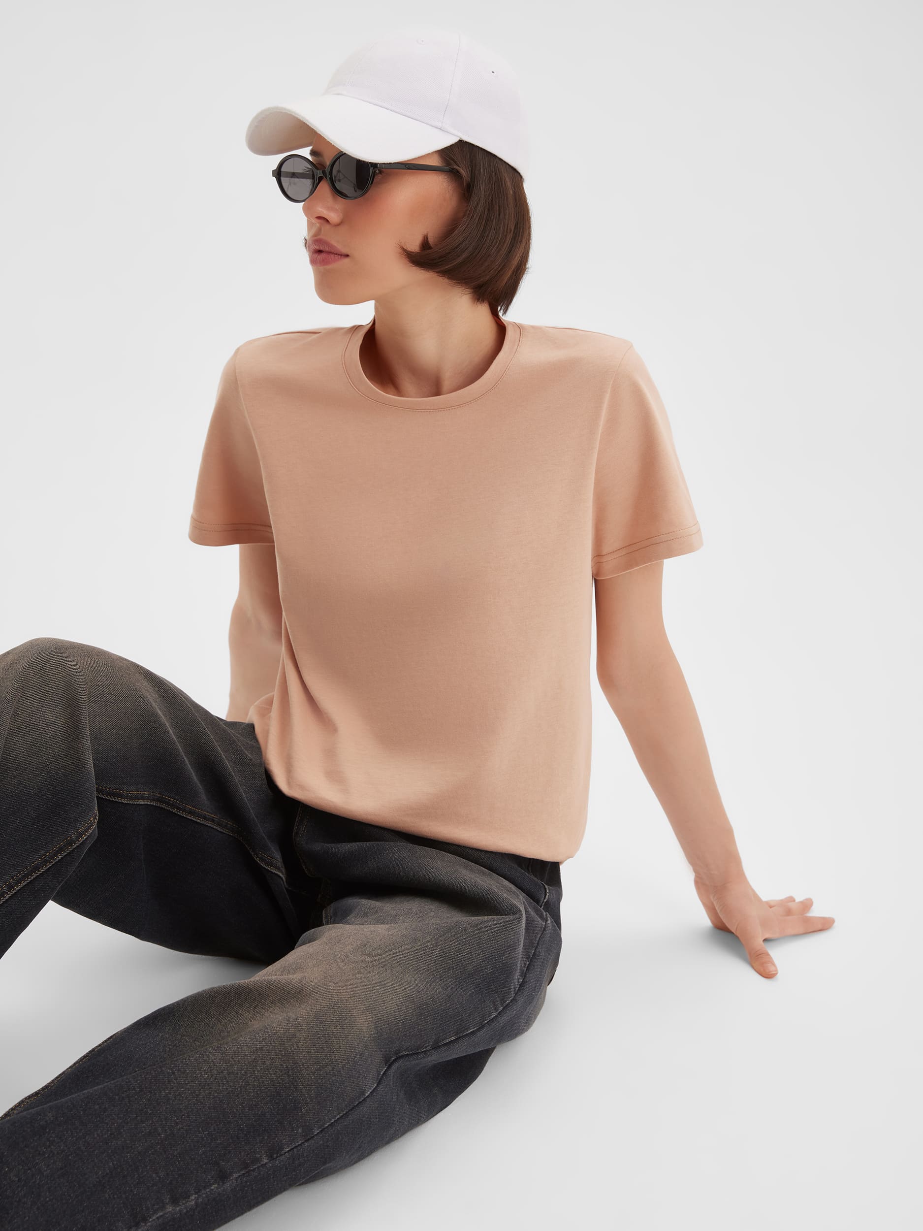 Футболка женская из кулирной глади, 100% хлопок. Плотность 180г/м2. Прилегающий силуэт, короткий рукав и круглый воротник. Низ футболки и низ рукава обработаны швом в подгибку шириной в 2 см. Приталенный крой выгодно подчеркивает женскую фигуру.
