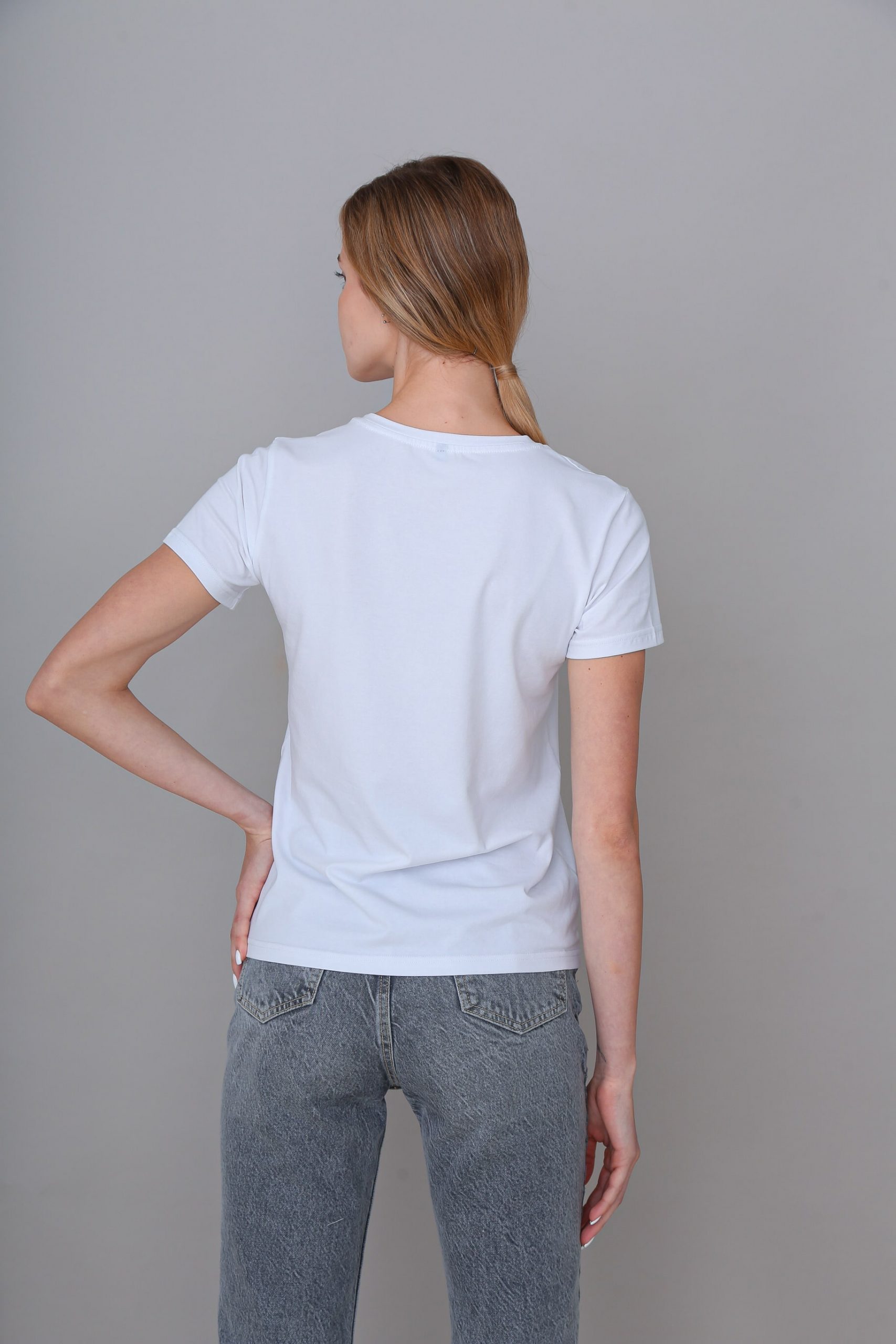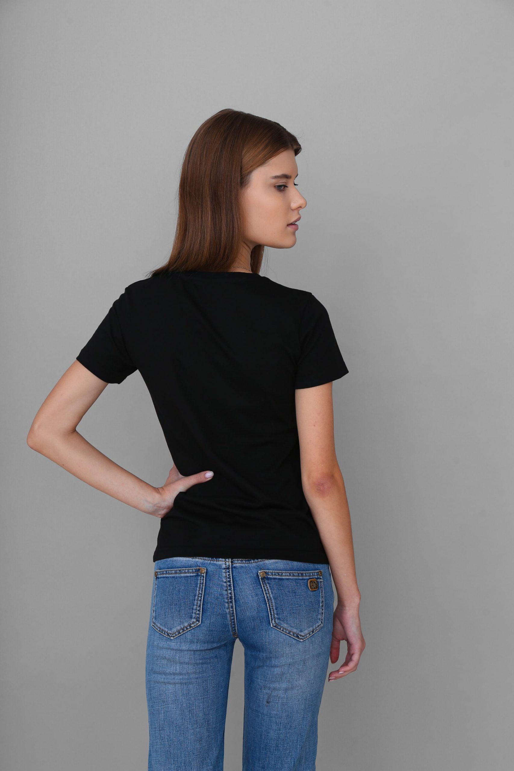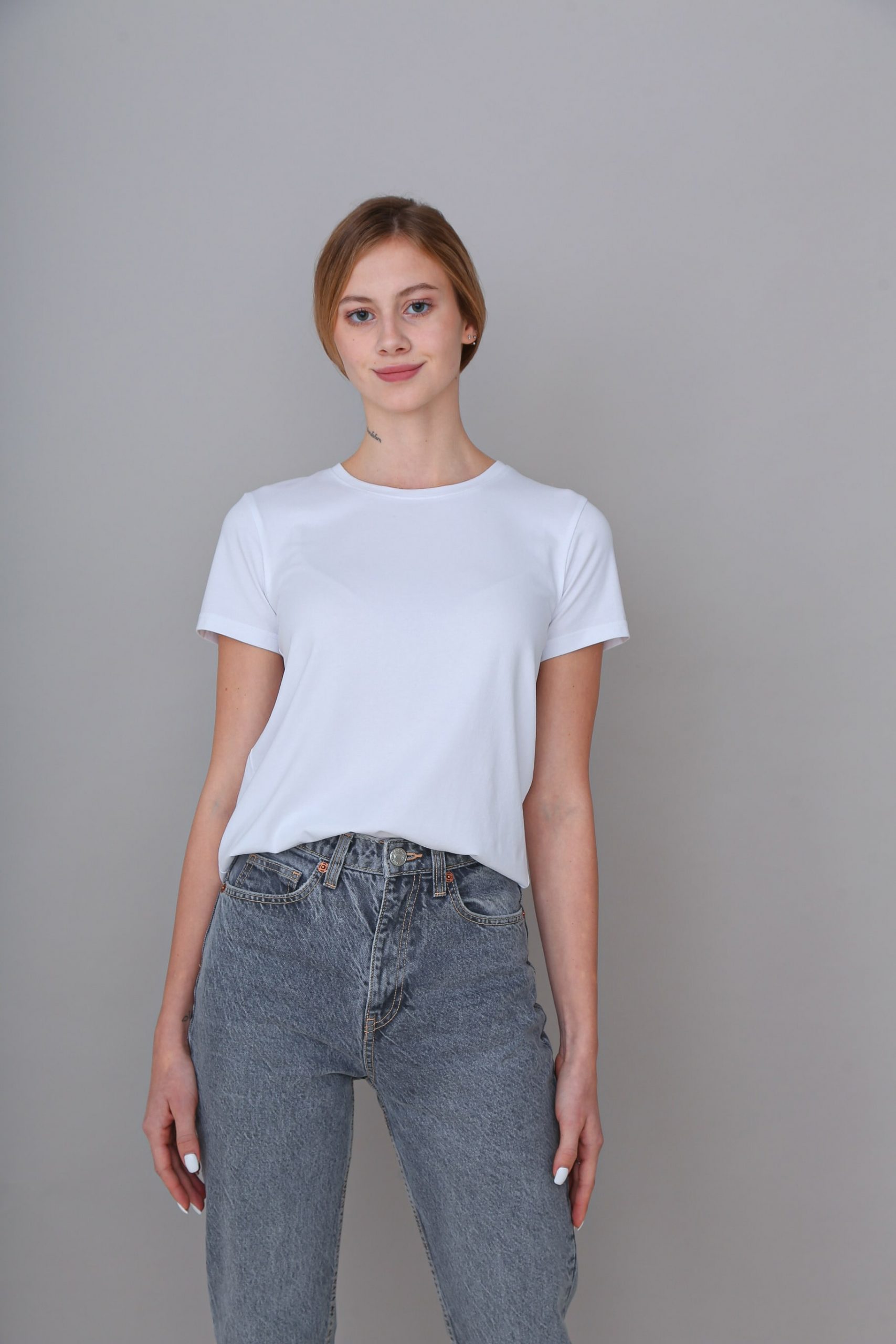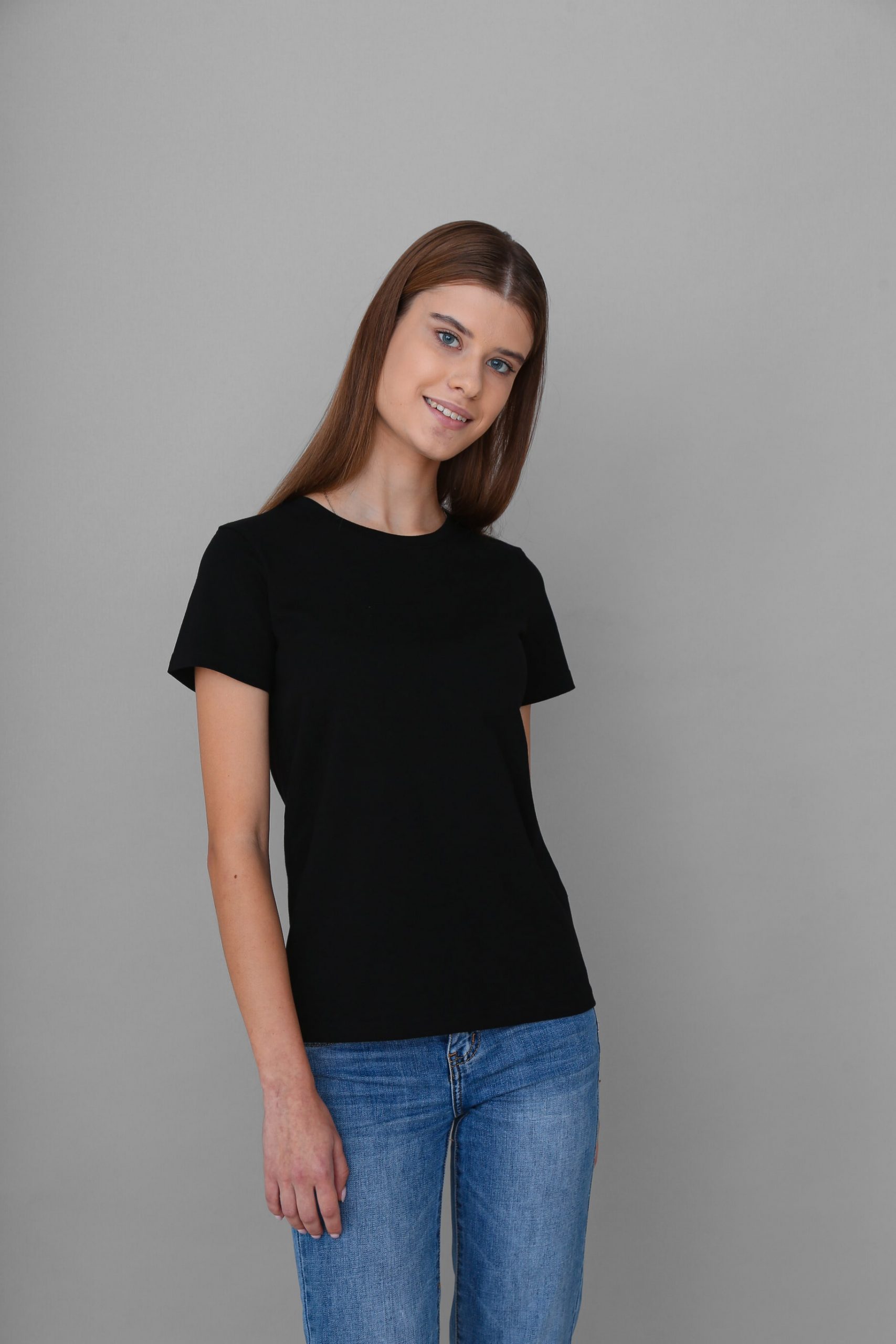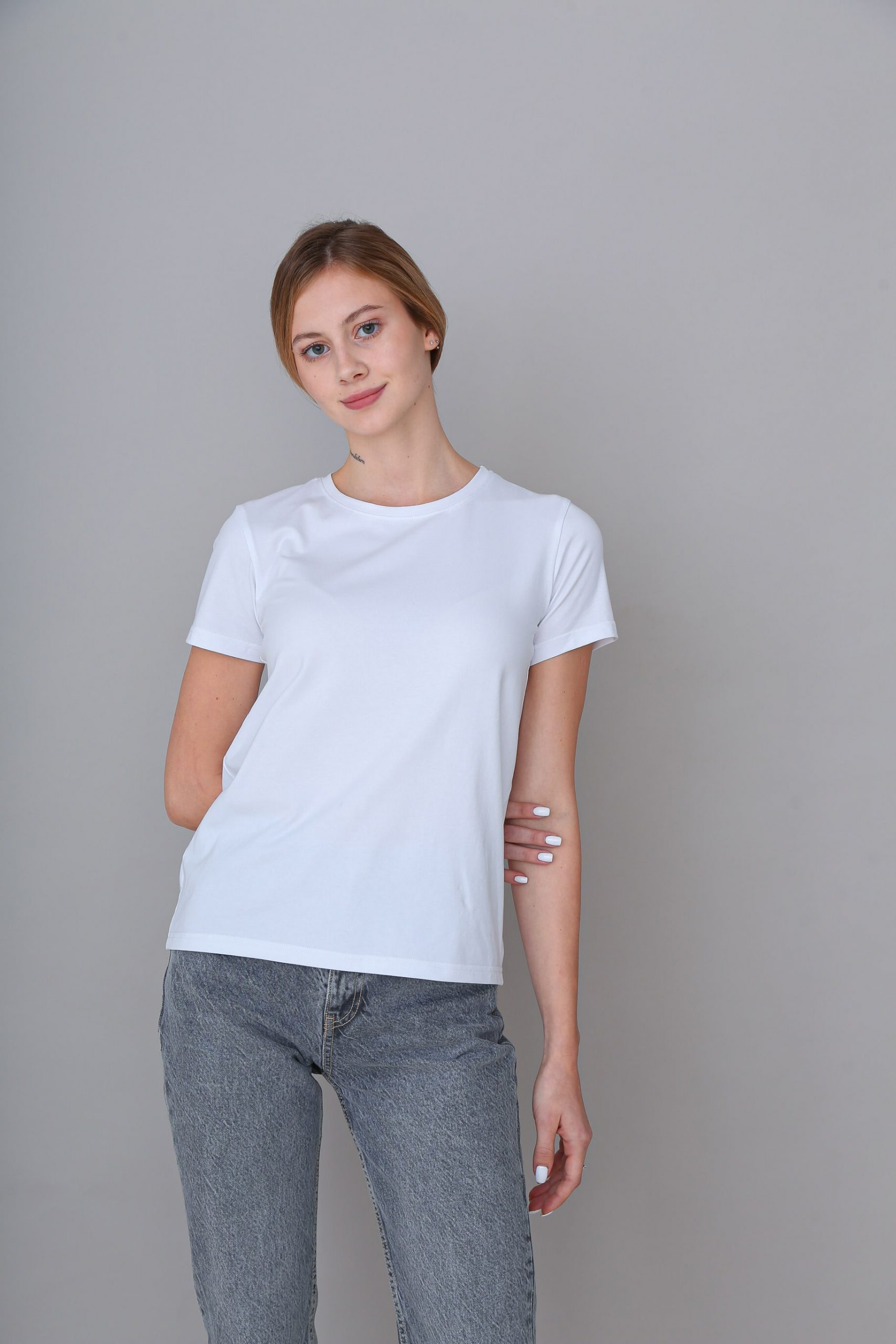 Футболка женская из кулирной глади, 100% хлопок. Плотность 180г/м2. Прилегающий силуэт, короткий рукав и круглый воротник. Низ футболки и низ рукава обработаны швом в подгибку шириной в 2 см. Приталенный крой выгодно подчеркивает женскую фигуру.