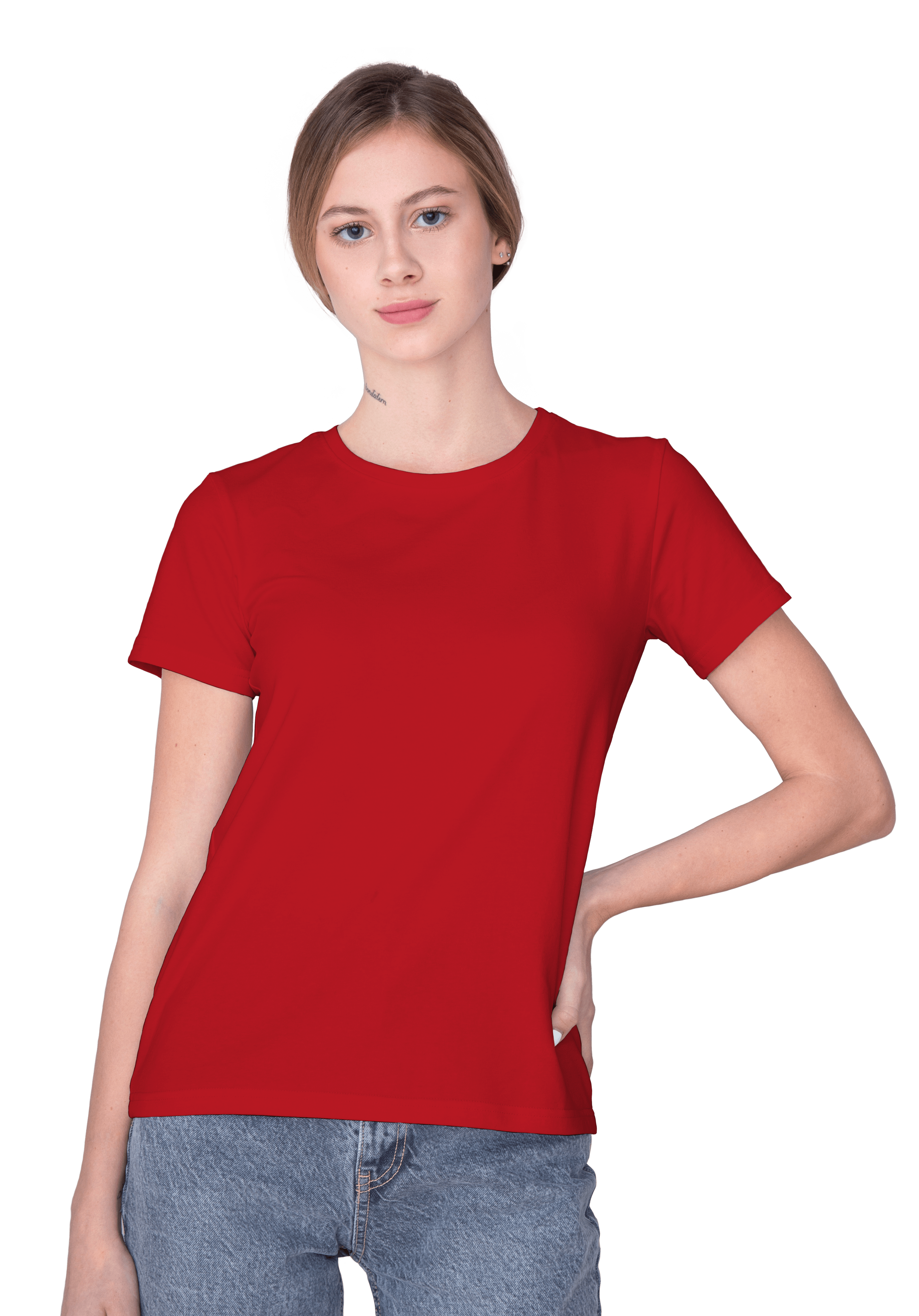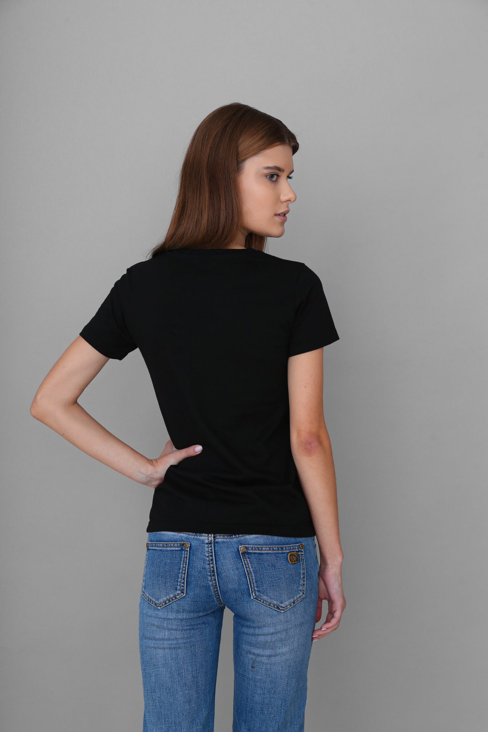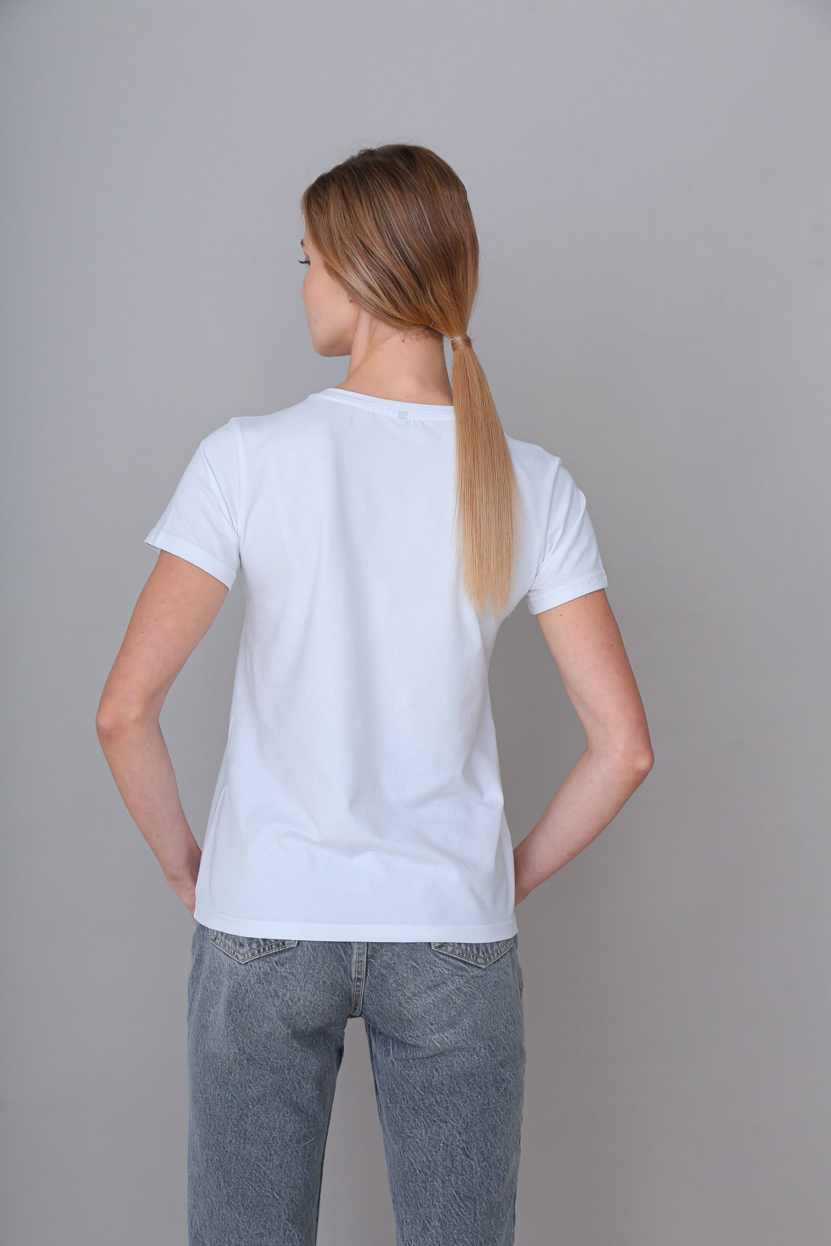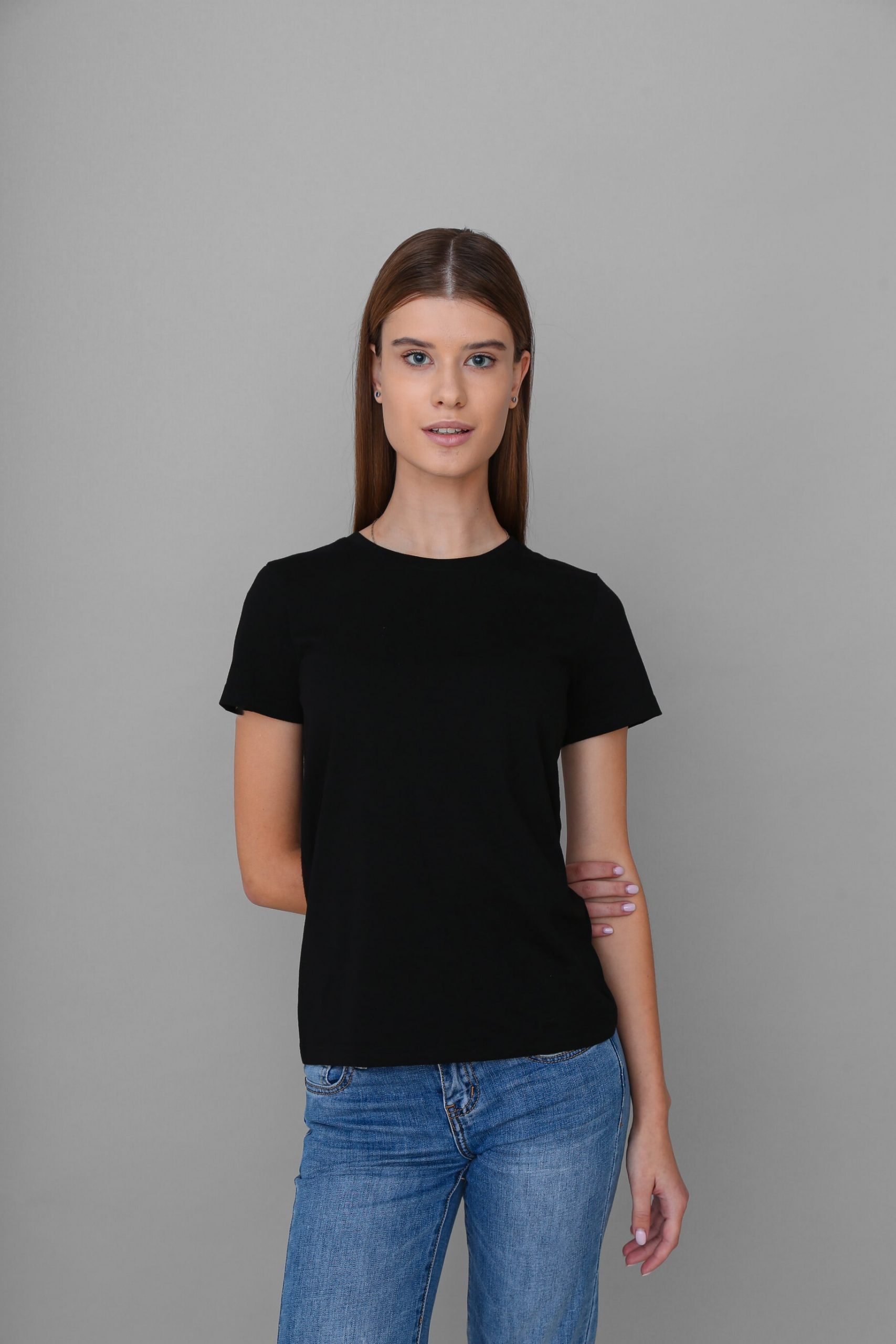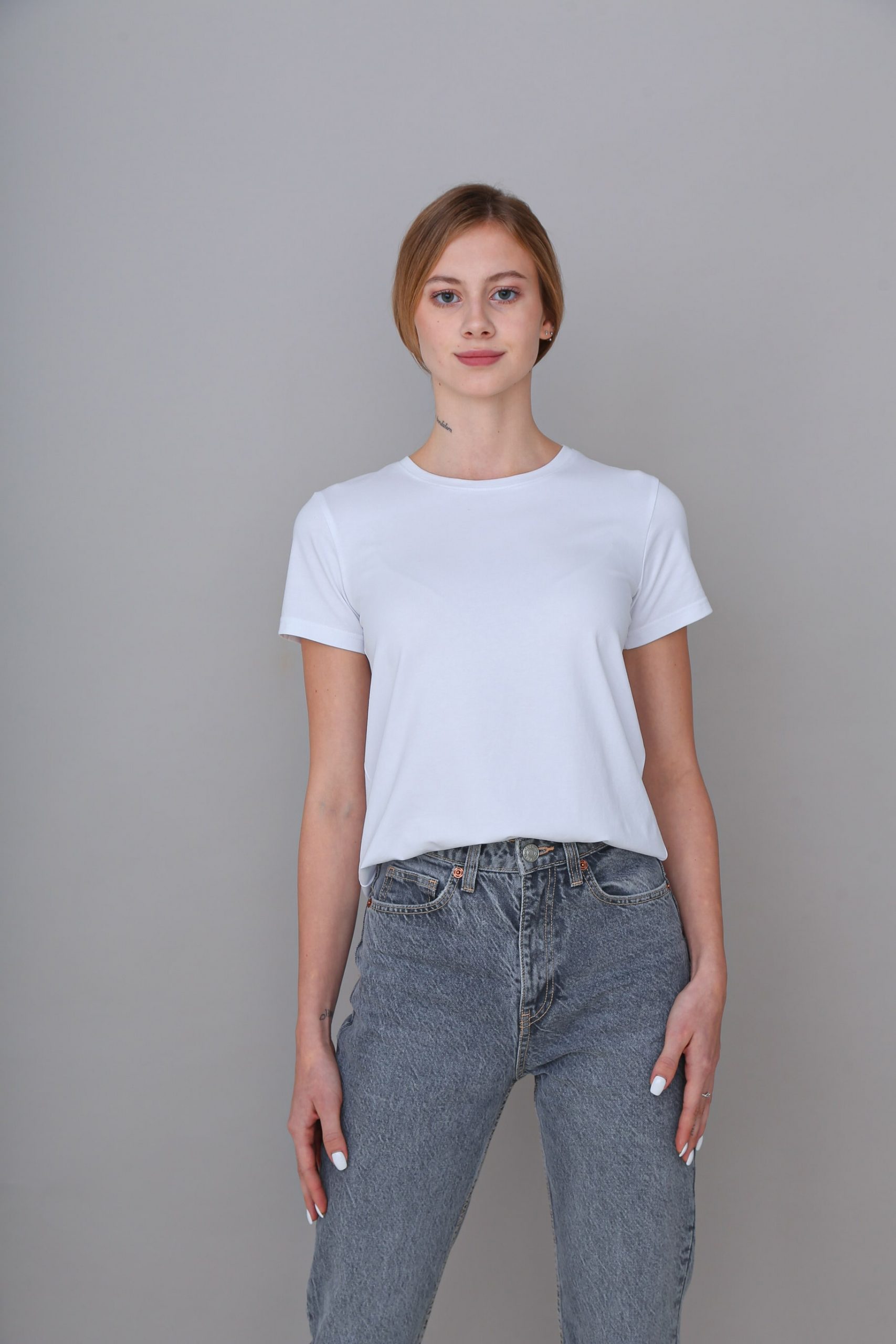 Футболка женская из кулирной глади, 100% хлопок. Плотность 180г/м2. Прилегающий силуэт, короткий рукав и круглый воротник. Низ футболки и низ рукава обработаны швом в подгибку шириной в 2 см. Приталенный крой выгодно подчеркивает женскую фигуру.