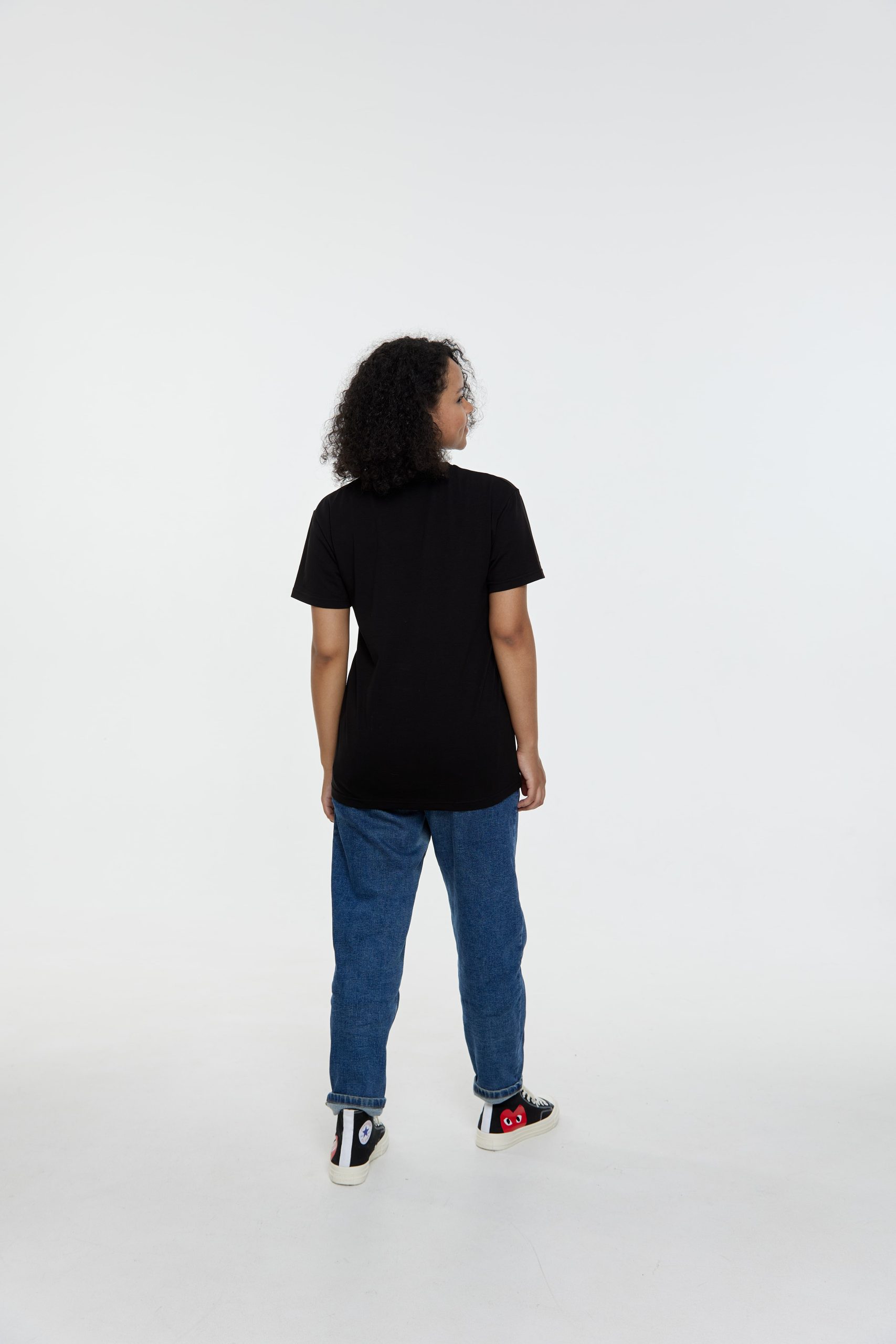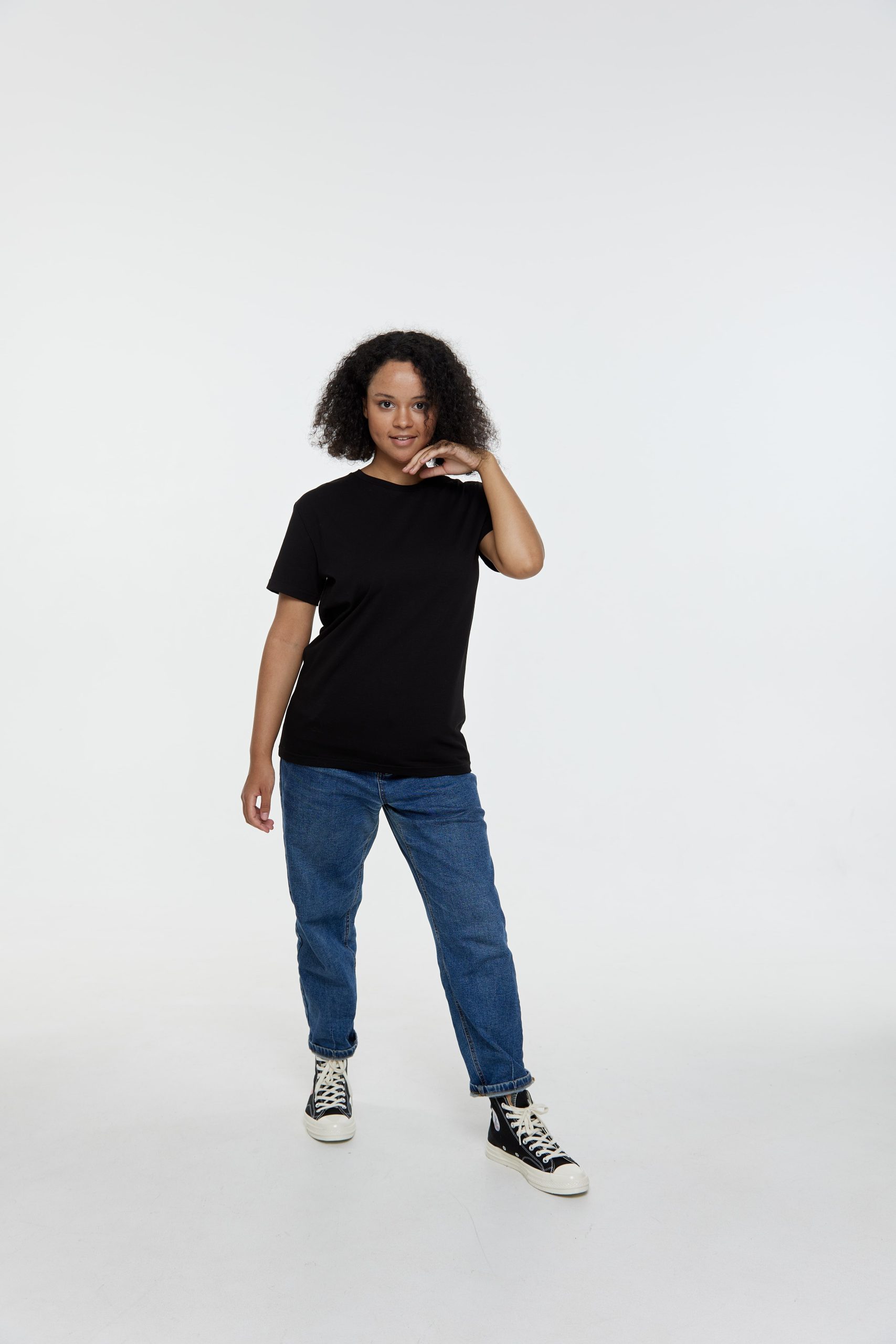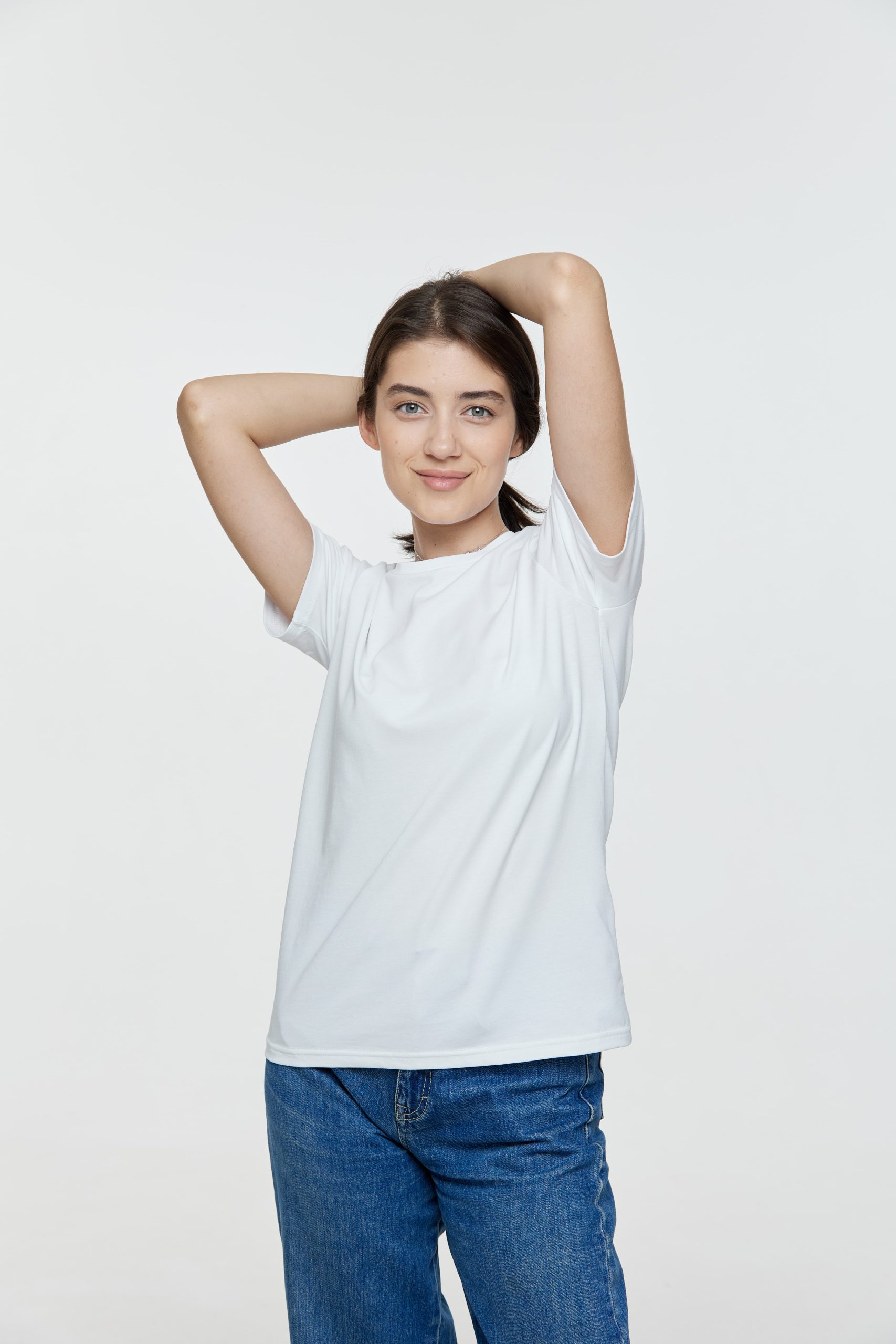 Футболка женская из кулирной глади, 100% хлопок. Плотность 180г/м2. Свободный силуэт, удлиненный рукав и круглый воротник. Низ футболки и низ рукава обработаны швом в подгибку шириной в 2 см.