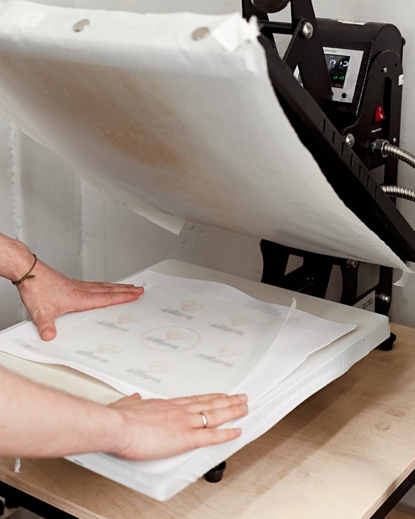Принт закрепляется с помощью термопресса при контакте изделия с плитой термопресса при температуре 170 °C. В связи с этим возможно образование следов давления на ткани, которые легко устранить постирав изделие.